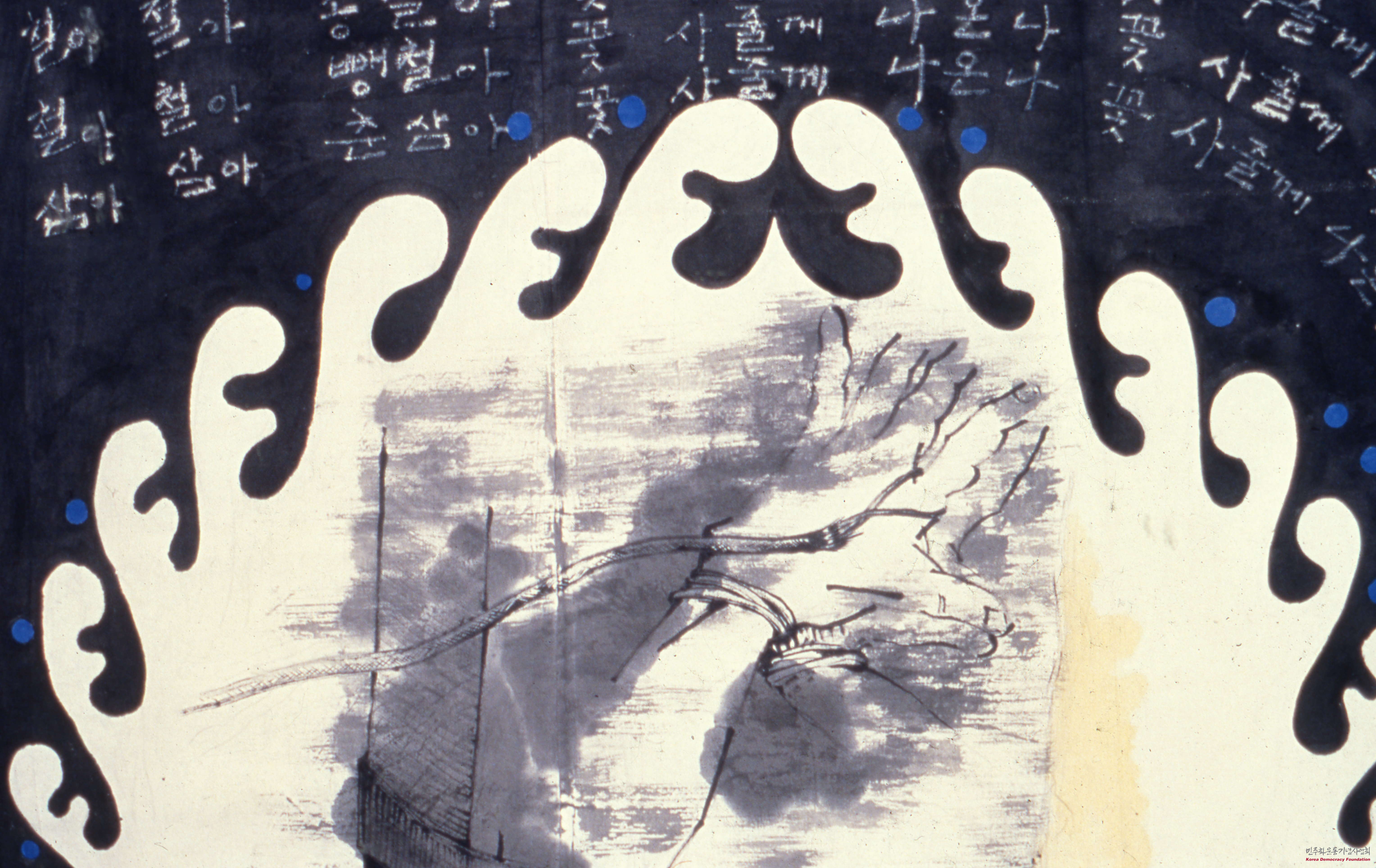 - 작가 문영태의 작품 심상석과 고문받는 남자와 가운데 꽃의 모습이 담긴 작품 1점이 담겨 있음