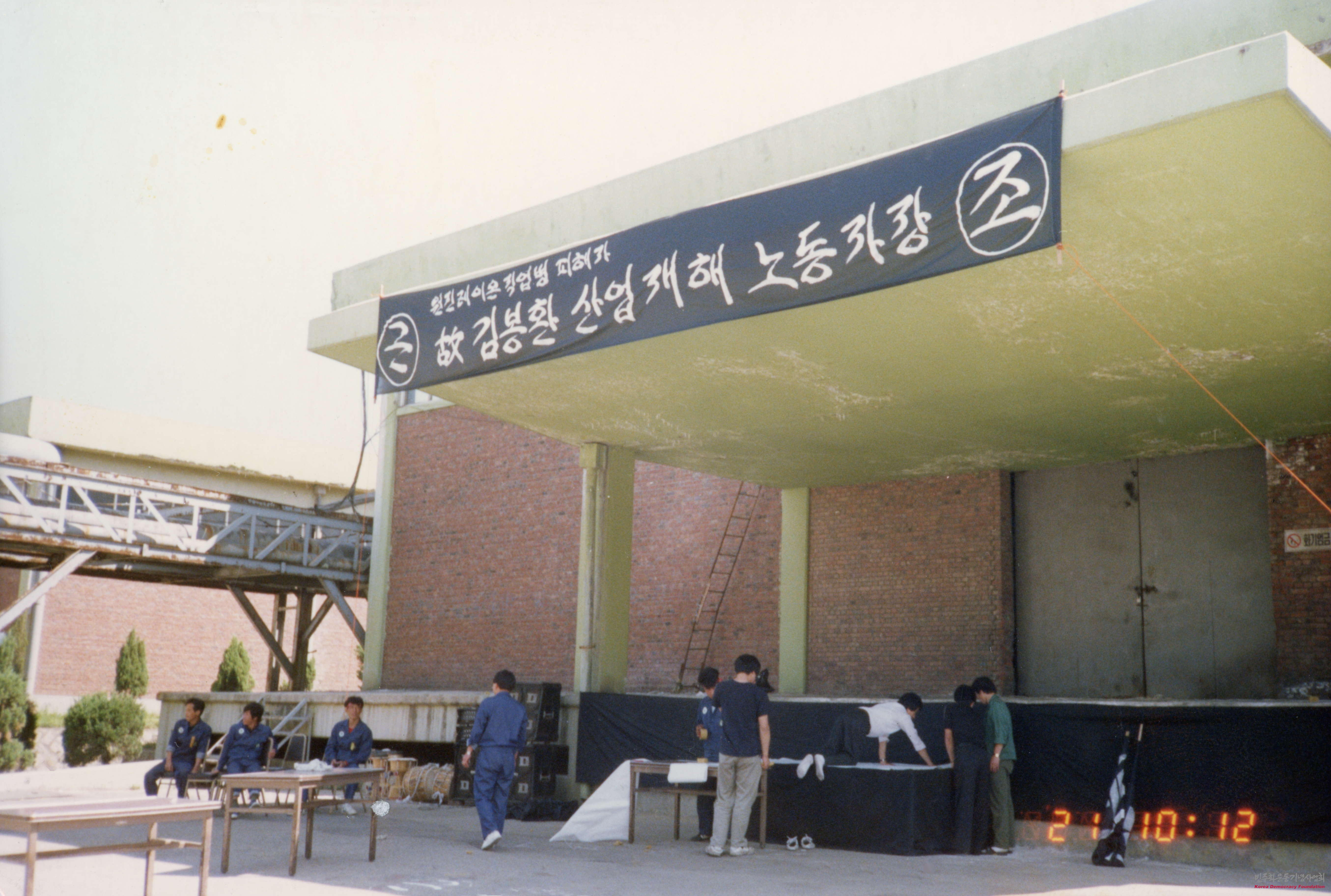 - 1991년 1월5일 숨진 원진레이온 퇴직근로자 김봉환이 숨진지 1백37일 만인 21일 각계인사와 유족 근로자 등 4백여 명이 참석한 가운데 당시 경기 미금시 도농동 회사본관 앞 광장에서 산업재해 노동자장으로 장례식을 준비하는 모습이 담겨 있음