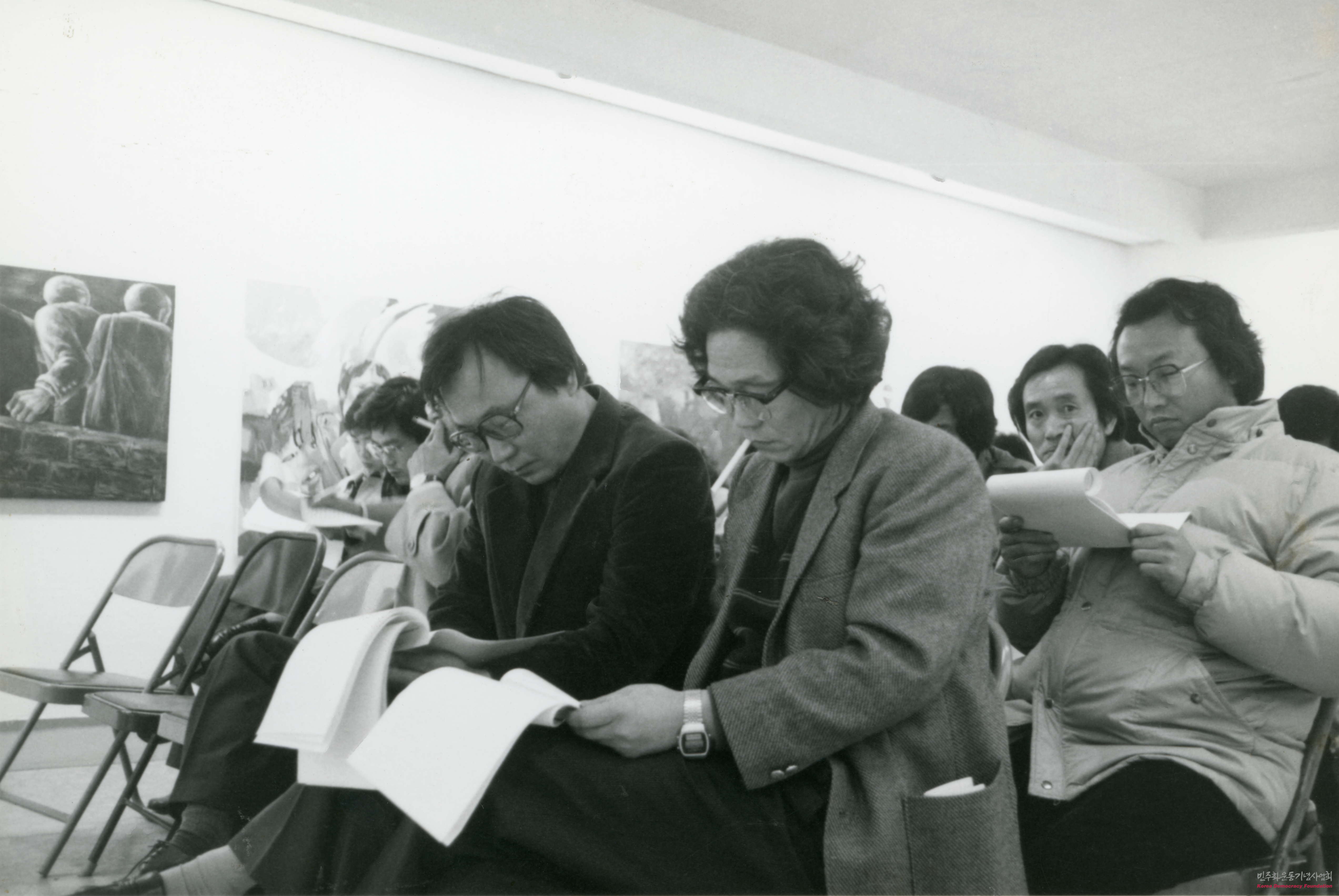 - 미술협의회 정기총회 사진으로 관련 유인물을 읽어보는 회원들의 모습과 일부 식순이 담겨 있음