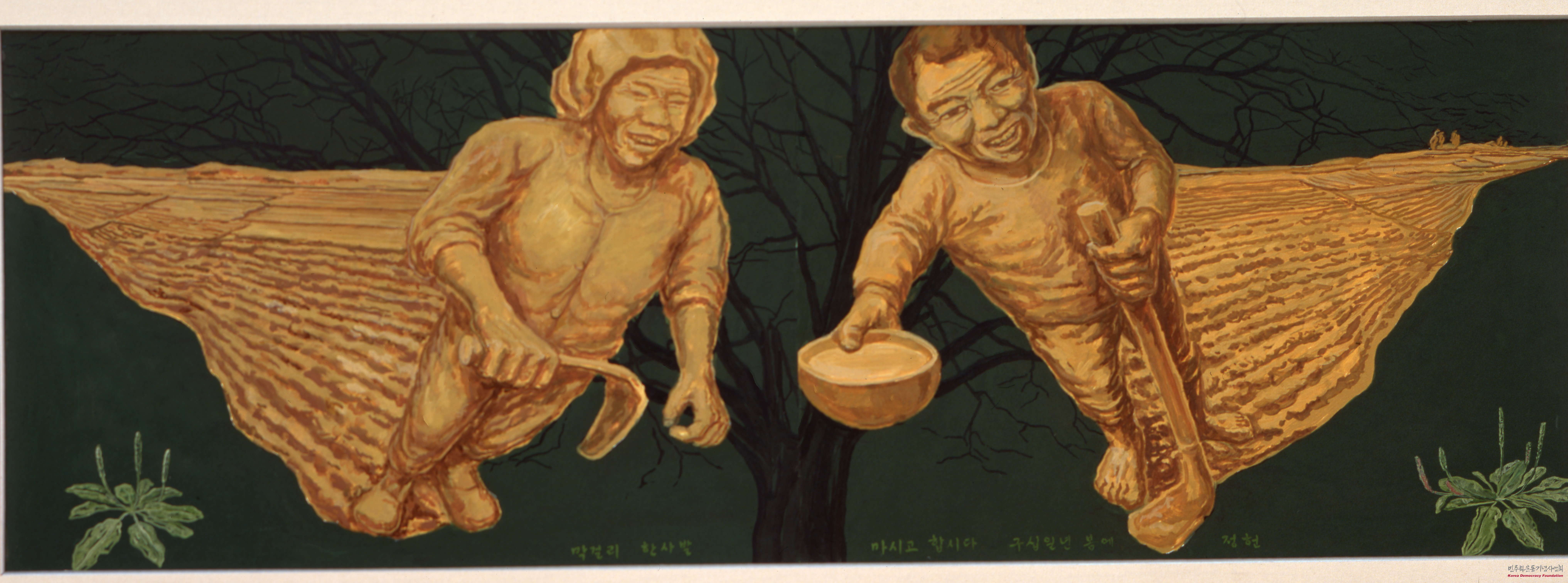 - 김정헌의 1991년작 막걸리 한사발로 농사를 짓고 있는 남녀의 모습이 담겨 있음