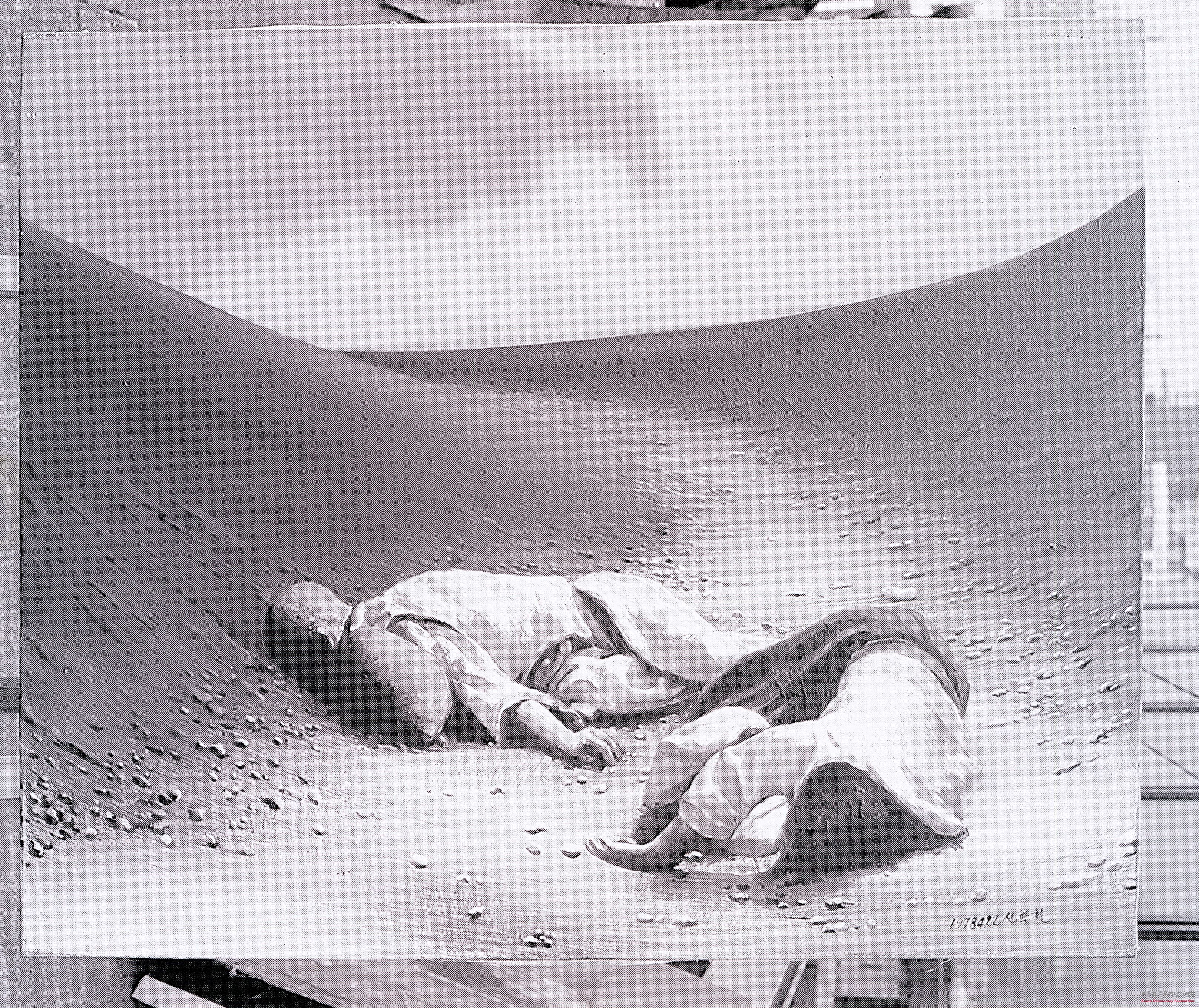 - 1978년 4월 22일 완성된 신학철의 작품을 촬영한 필름으로, 길가에 쓰러져 있는 두 사람의 모습이 담겨 있음