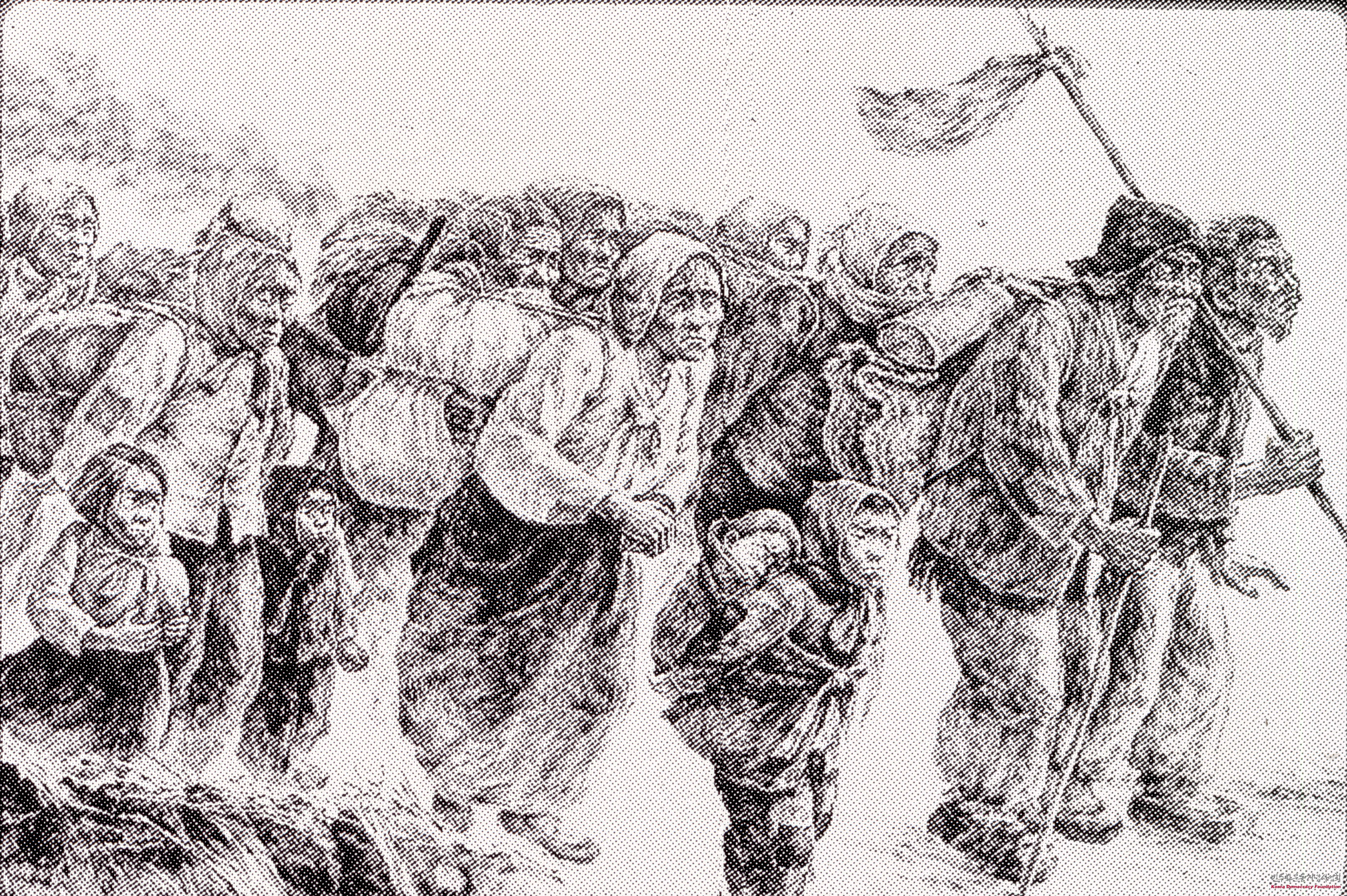 - 짐을 싸고 이주하는 농민들의 모습, 전통 악기를 연주하며 돌덩이를 던지고 있는 농민들의 모습 등을 그린 그림을 촬영한 필름