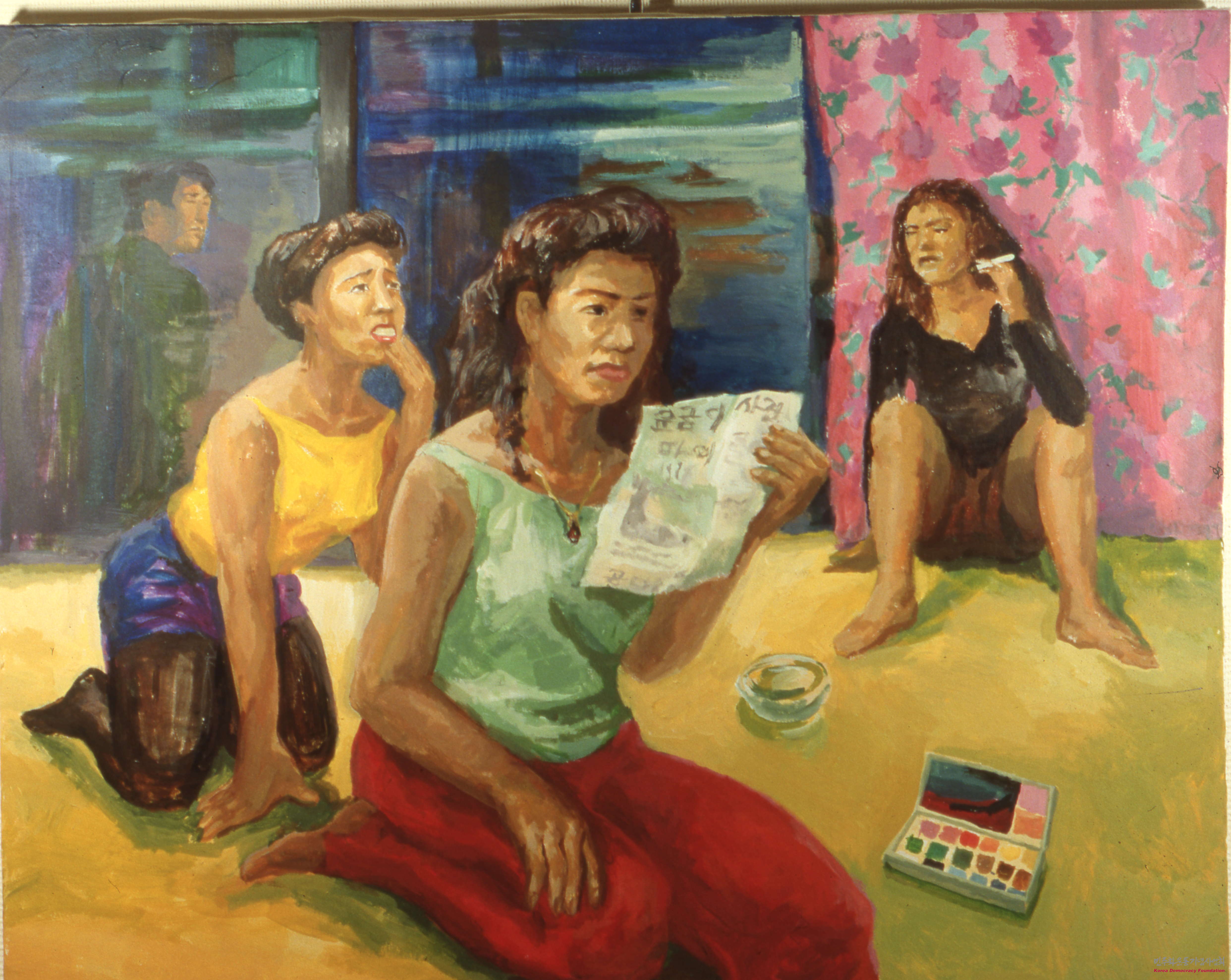 - 1992년 10월 28일 동두천시 기지촌에서 미군에 의해 살해당한 윤금이 사건에 대한 신문 기사를 읽고 있는 여성들의 모습이 담긴 그림, 철창 앞에 쭈그려 앉아있는 남성의 모습을 그린 그림 등이 담겨 있는 슬라이드 필름