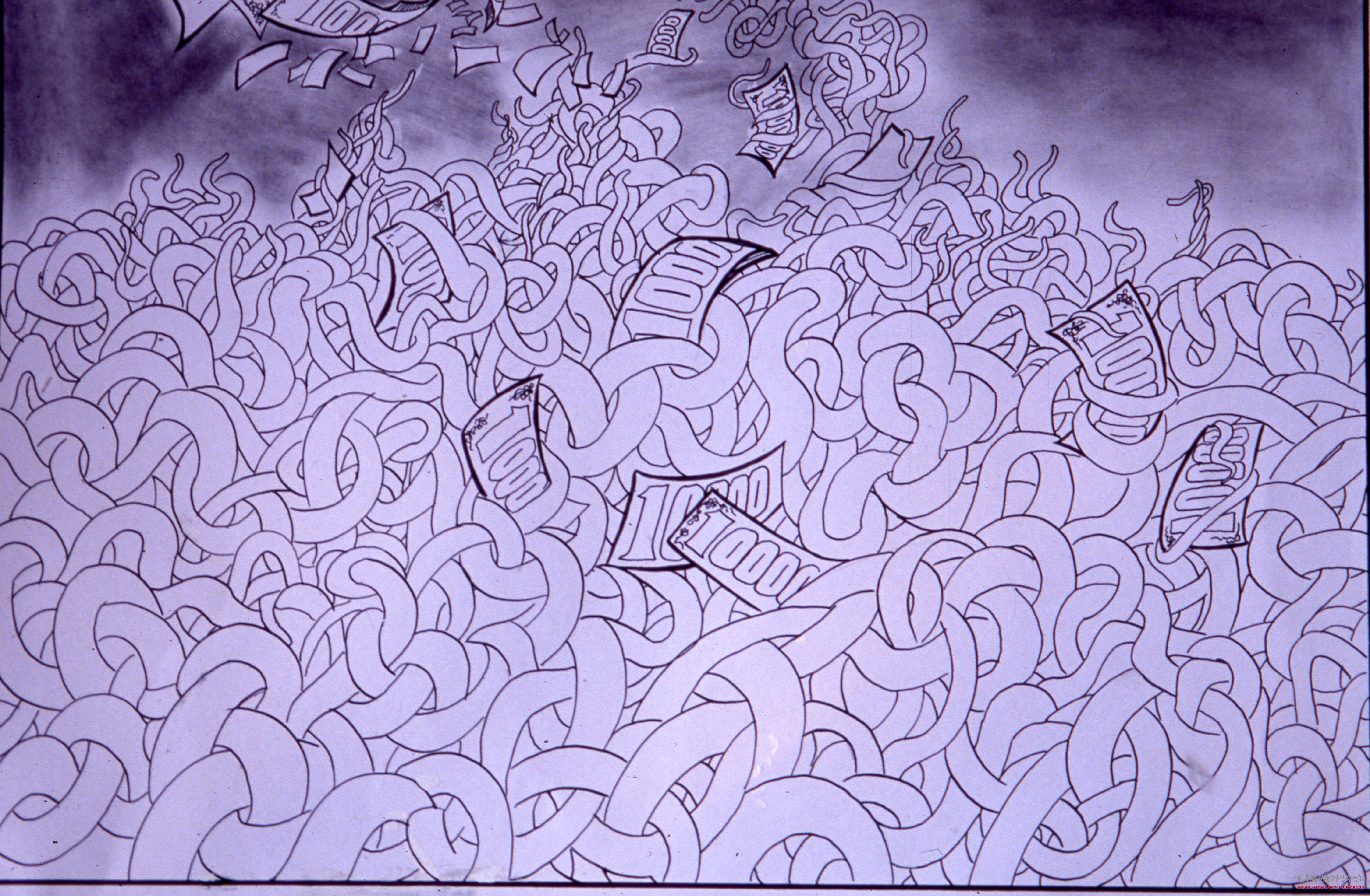 - 주완수 작가의 만화 작품이 담긴 슬라이드 필름으로, DMZ 앞에서 탐욕스러운 얼굴로 돈을 탐하는 노태우 전 대통령의 모습, 북한과의 외교 단절, 미국과의 사대외교, 언론 조작 등의 내용이 담겨 있음