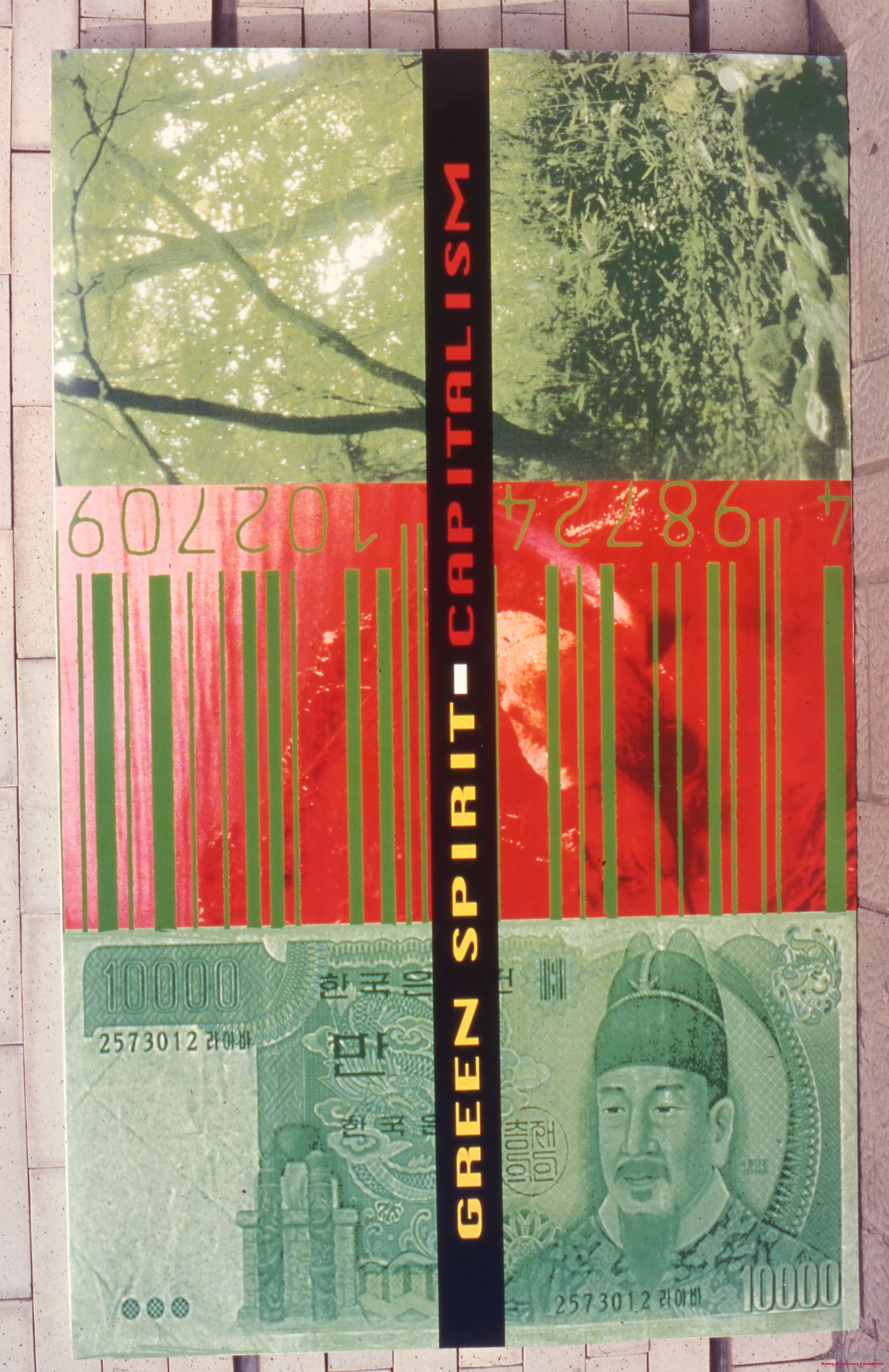 - 박경훈 작가의 작품이 담긴 슬라이드 필름으로, GREEN SPIRIT은 이제 자연의 녹음이 아닌 만원권 지폐가 되었으며 점차 자본주의화 되고 있다는 내용이 담겨 있음