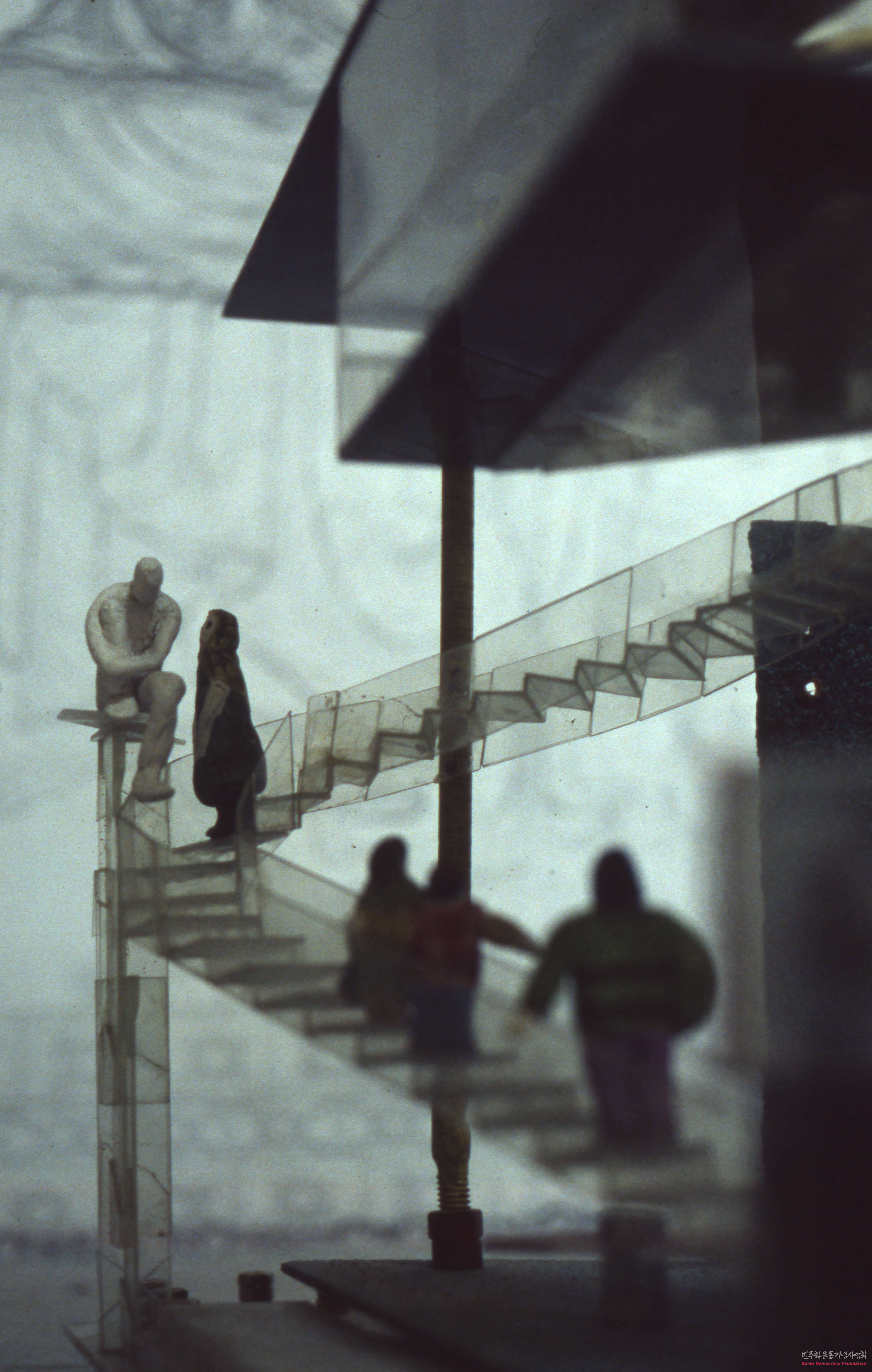 - 전미영 작가의 작품 'Museum Display'의 슬라이드 필름으로, 계단에 설치된 작품을 감상하는 사람들의 모습이 담겨 있음