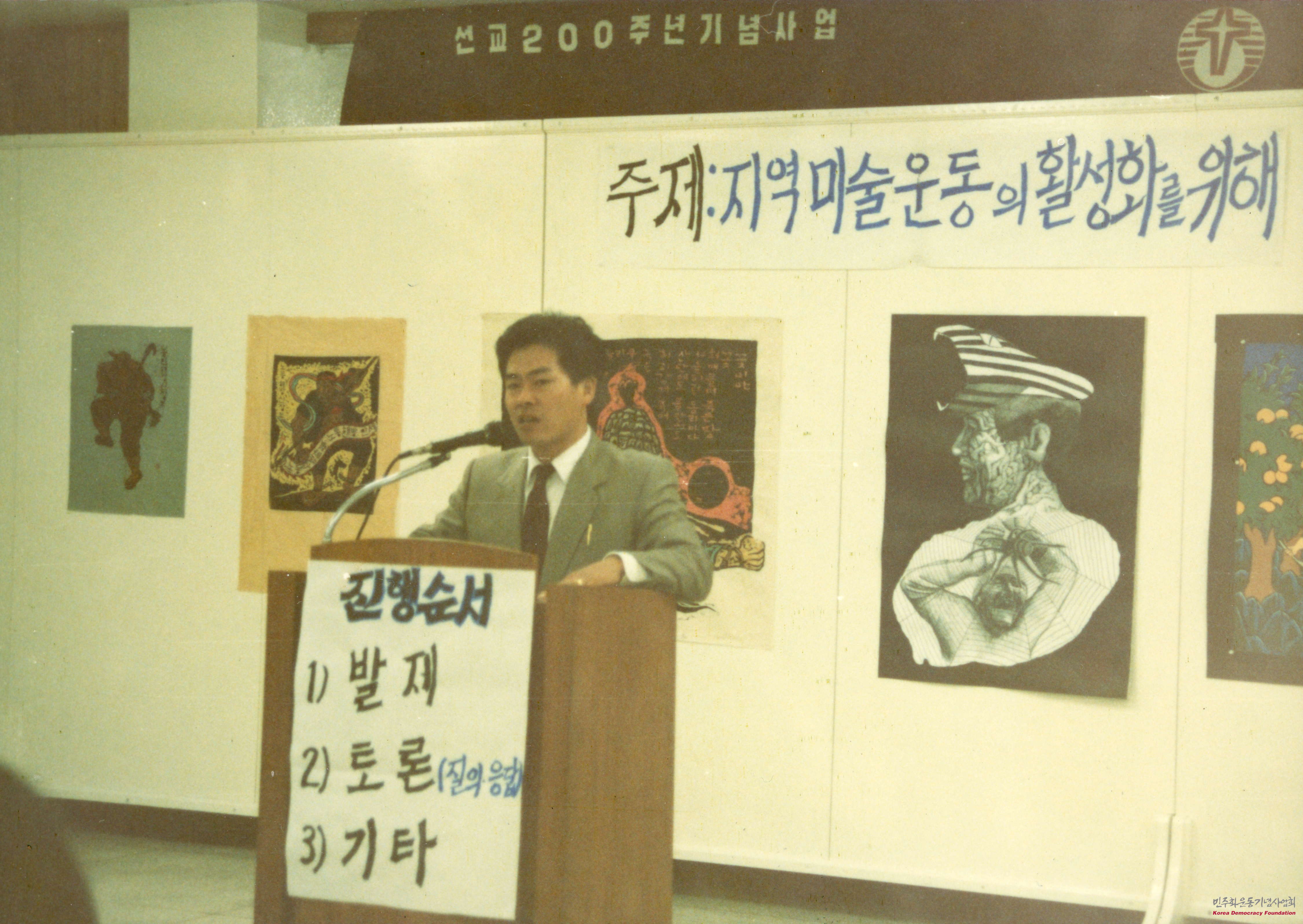 - 선교 200주년 기념사업의 일환으로 열린 토론회에서, '지역미술운동의 활성화를 위해' 라는 주제로 발제를 진행하고 있는 한 사람의 모습이 담긴 사진으로, 발표를 경청하고 있는 대중과 해당 공간의 전경 사진을 포함하고 있음