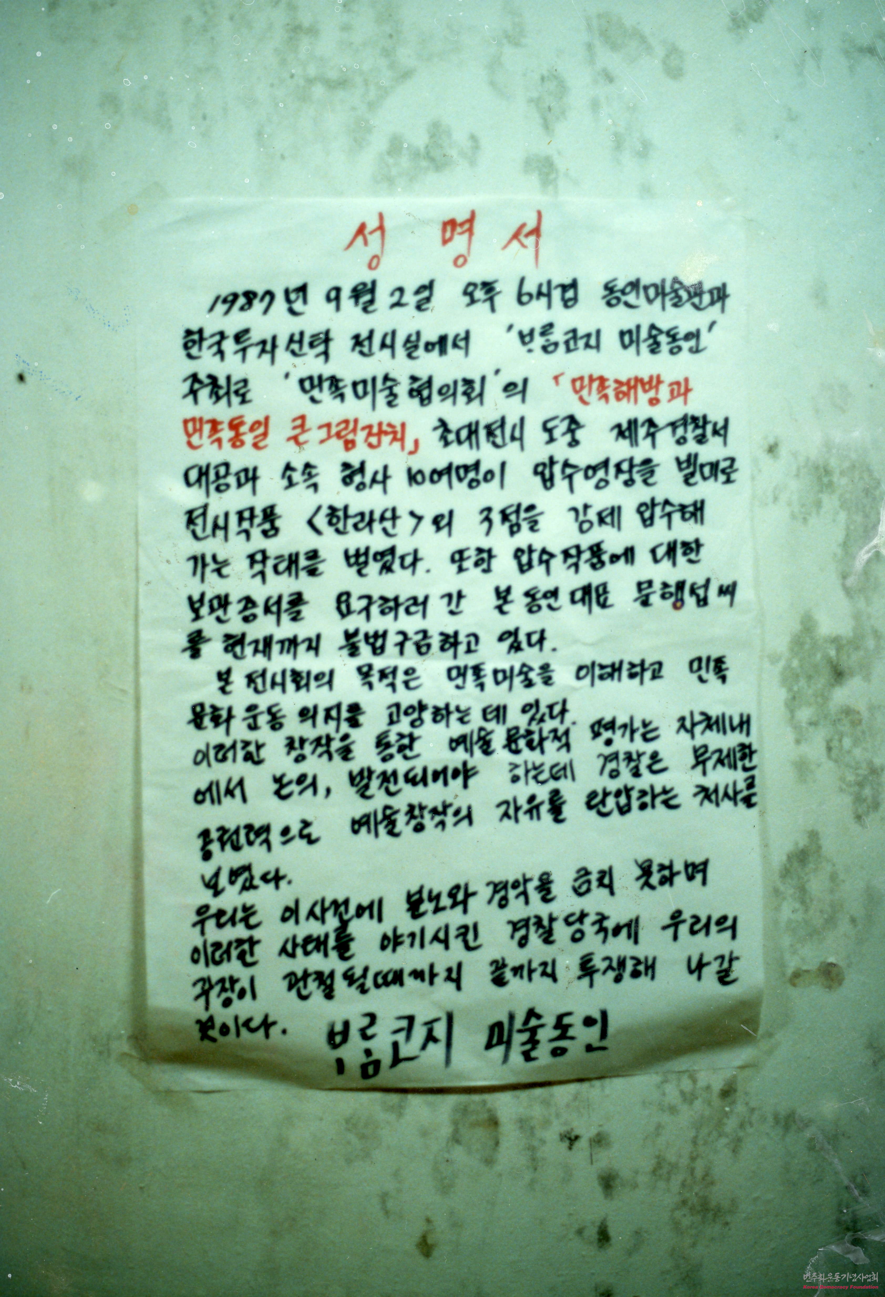 - <민족해방과 민족통일 큰그림잔치>초대전시 도중 제주경찰서 대공과 소속 형사 10여 명이 압수영장을 빌미로 전시작품 '한라산' 외 3점을 강제 압수해간 것과 이에 항의하러 간 문행섭씨 불법구금에 대한 분노로 투쟁할 것을 성명한 글을 벽지에 붙인 것