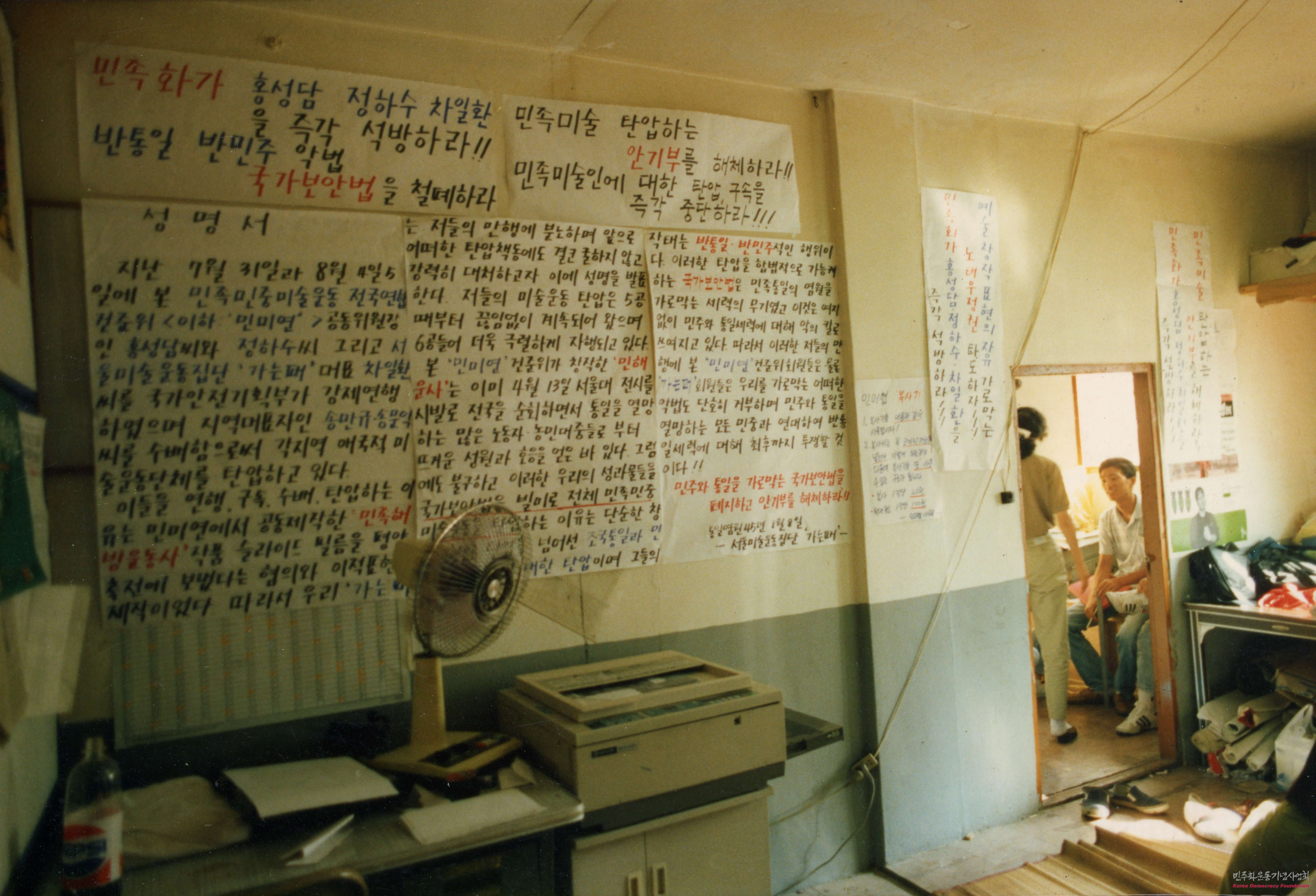 - 서울미술운동집단 가는패에서 “민족화가 홍성담, 정하수, 차일환 석방과 함께 민족미술운동을 탄압하는 안기부를 해체하라”라는 문구로 투쟁 중인 모습을 담은 사진으로, 벽지에 전지 3면 분량의 성명서가 부착되어 있음