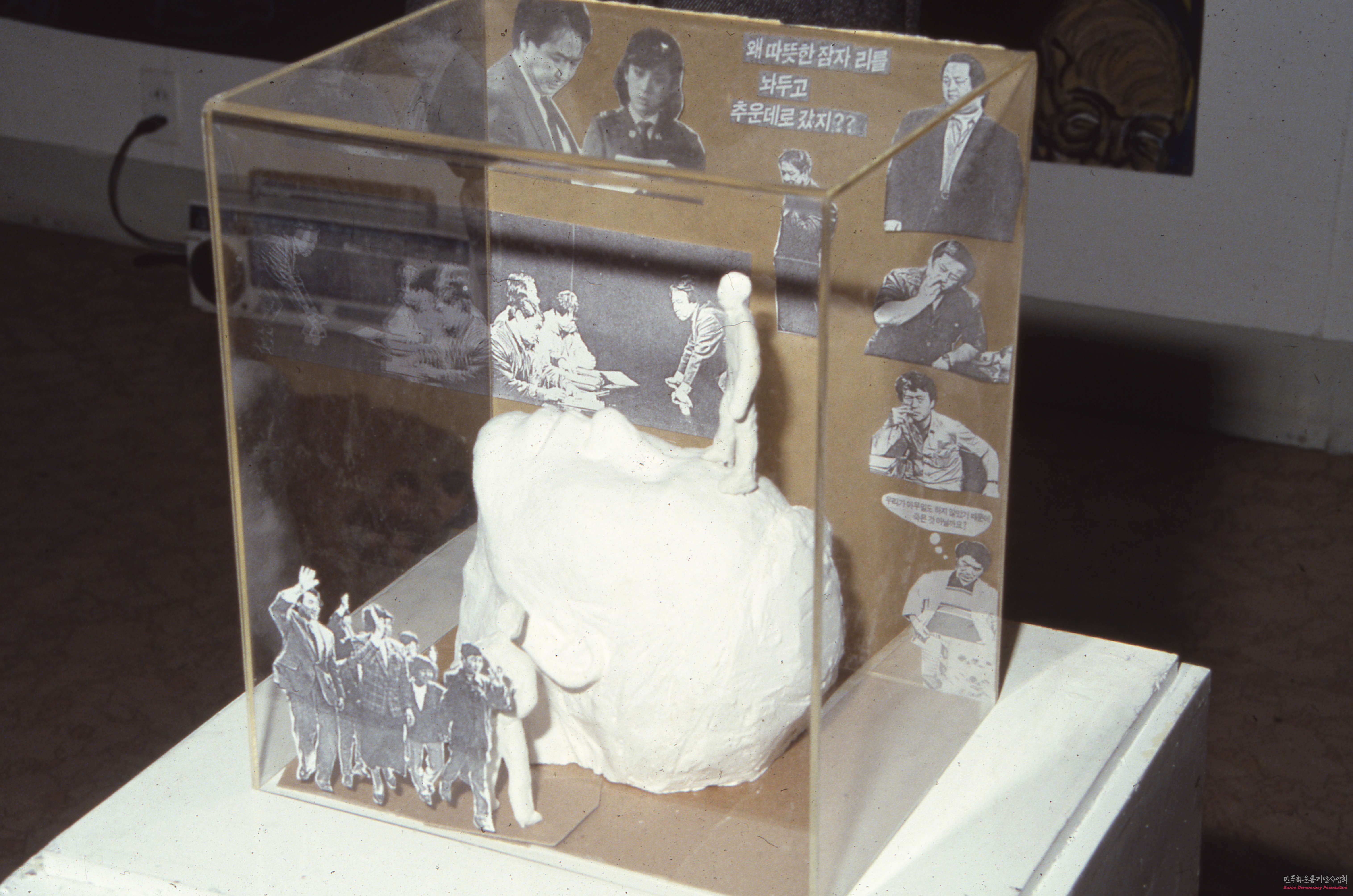 - 안규철 작가의 누워있는 큰 사람과 그 위에 올라가 있는 작은 사람과 그걸 바라보는 사람 슬라이드 필름으로, 이 당시 안규철은 종이 점토와 석고와 수채화 물감으로 채색한 '이야기 조각' 작업을 즐겨함