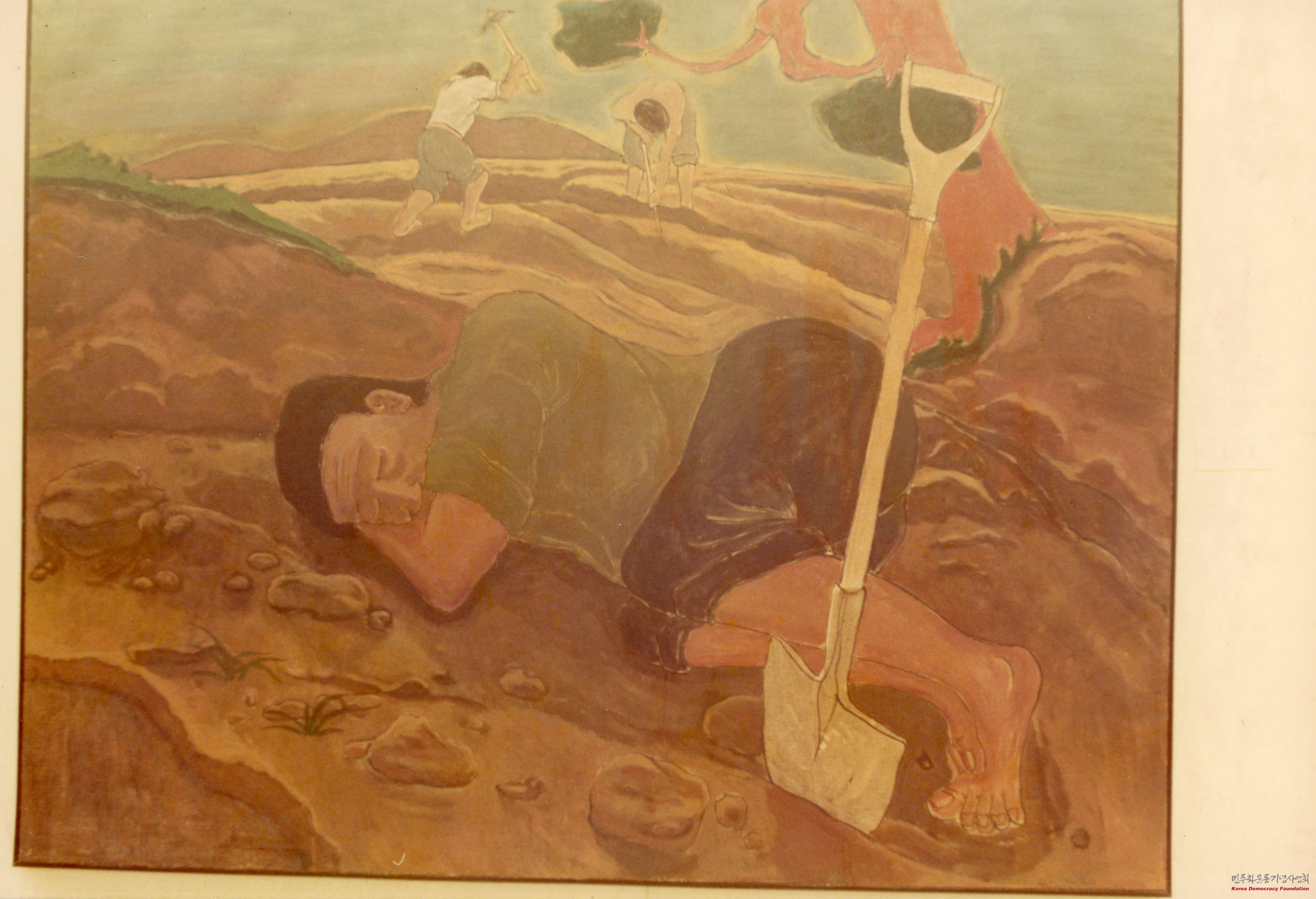 - 미술동인 두렁의 작품이 담긴 사진으로, 밭일을 하다가 지쳐 쓰러진 농부의 모습을 그린 그림이 담겨 있음