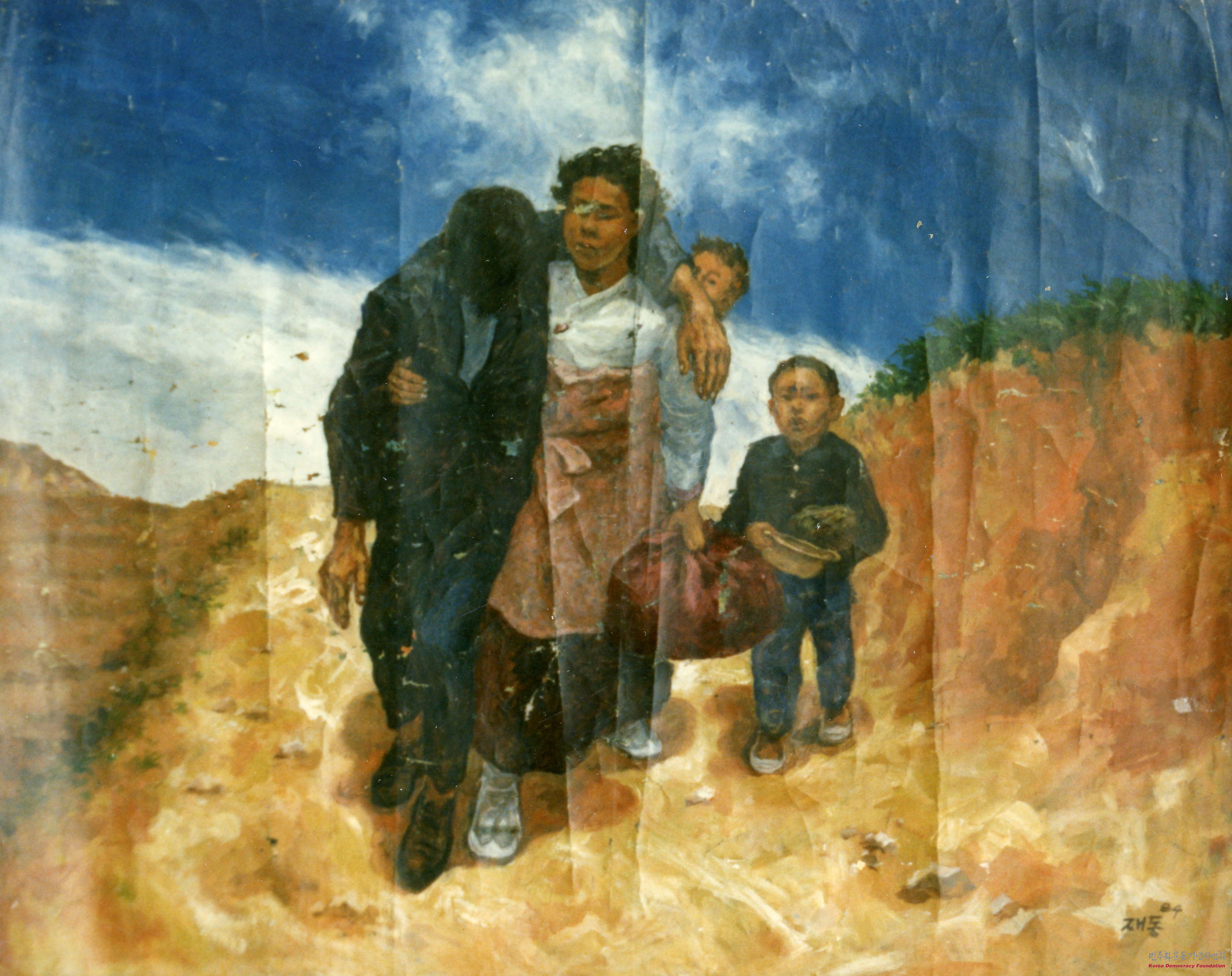 - 박재동 작가의 작품이 담긴 사진으로, 만신창이가 된 남성이 여성의 부축을 받으며 가족들과 이동하는 모습, 수산물을 파는 여성의 모습 등을 그린 그림이 담겨 있음