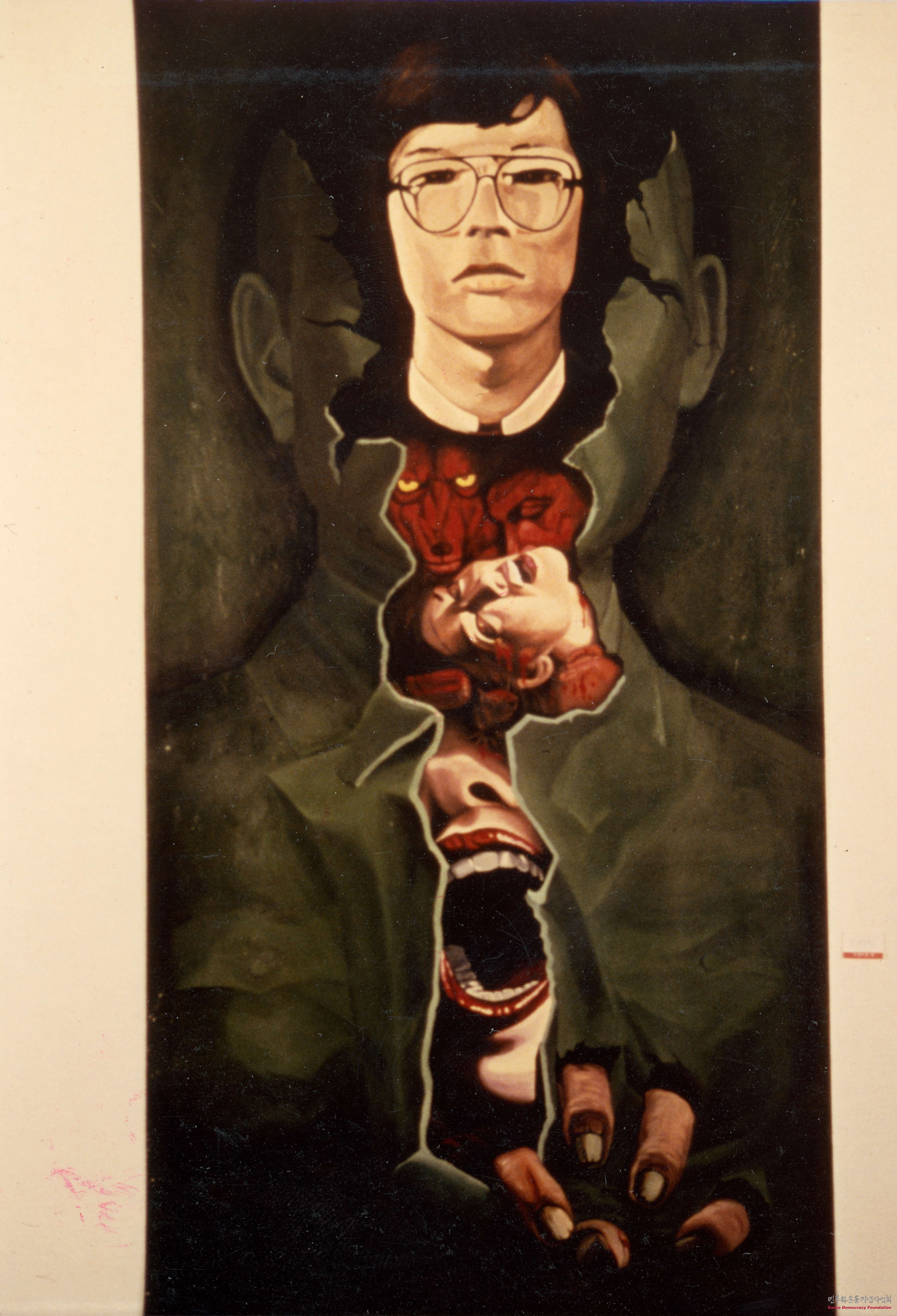 - 전두환의 군복 안에 고문치사사건 피해자 박종철 열사, 부천경찰서 성고문 사건의 피해자 권인숙씨의 모습을 그린 '부활', 한국 근현대사에서 중요한 사건들을 대표하는 이미지를 몽타주 화법으로 그려낸 '한국근대사-종합' 등 신학철 작가의 작품이 담겨 있는 사진