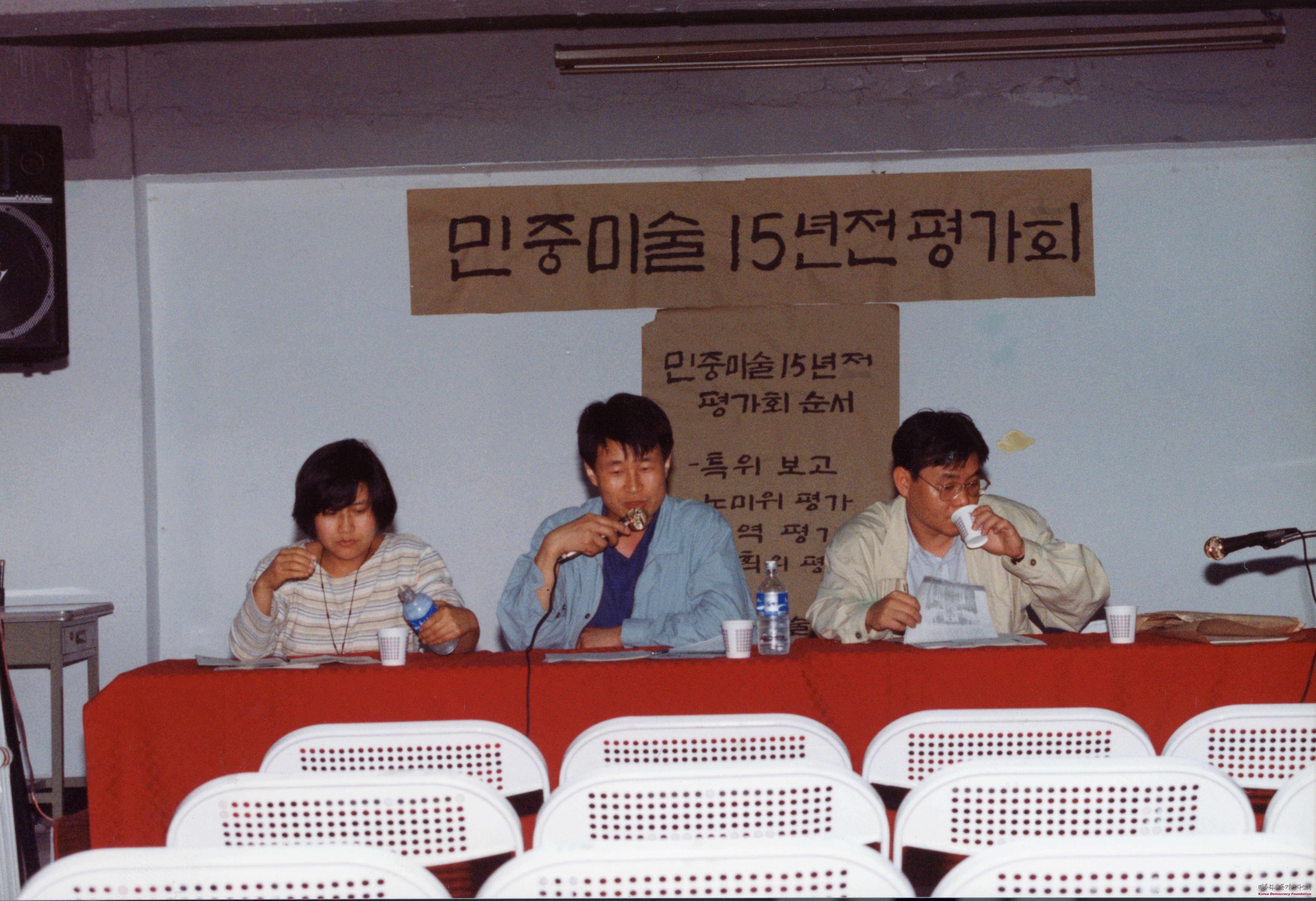 - 1994년 2월 국립현대미술관에서 개최되었던 '민중미술 15년전'에 대한 평가회를 촬영한 사진으로, 이 평가회는 특별위원회 보고로 시작하여 노동미술위원회 등 여러 분과들의 평가로 이어졌음