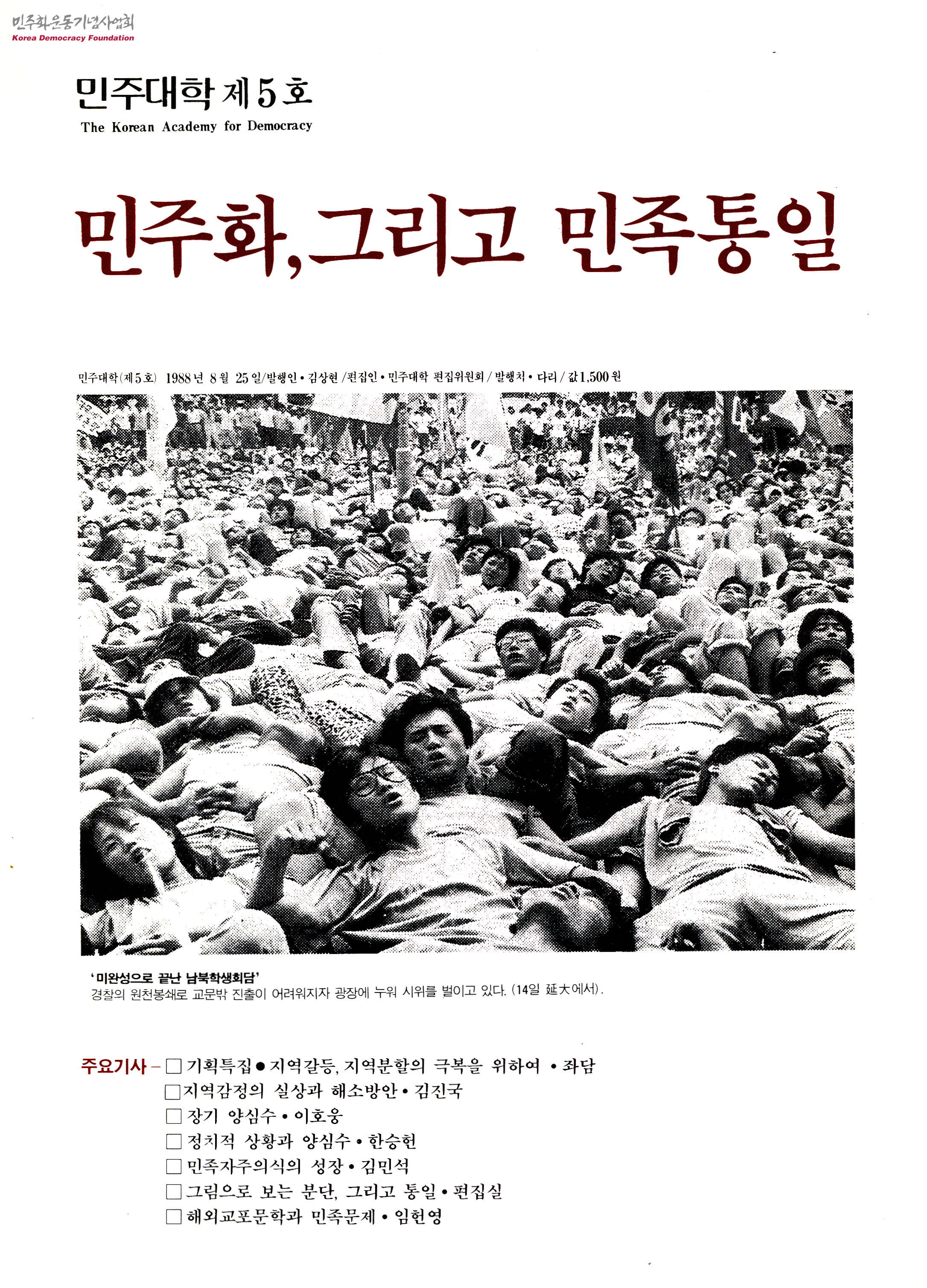 - 1988년 8월 25일 민주대학에서 발행한 민주대학 제5호 「민주화, 그리고 민족통일」로, 목차는 다음과 같음 - 권두언 : 동서화해와 남북통일을 위하여 - 기획특집 : 민족의 화해, 민족의 통일 - 인권 : 장기 양심수 - 자료 : 양심수 명단 - 민족 자주의식의 성장 - 이야기 마당 : 그 여자의 그림 - 화보 : 그림으로 본 분단, 그리고 통일 - 통일 : 분단을 뛰어 넘어 - 문학 : 해외교포 문학과 민족문제 - 자료 : 통일관계 주요 연표