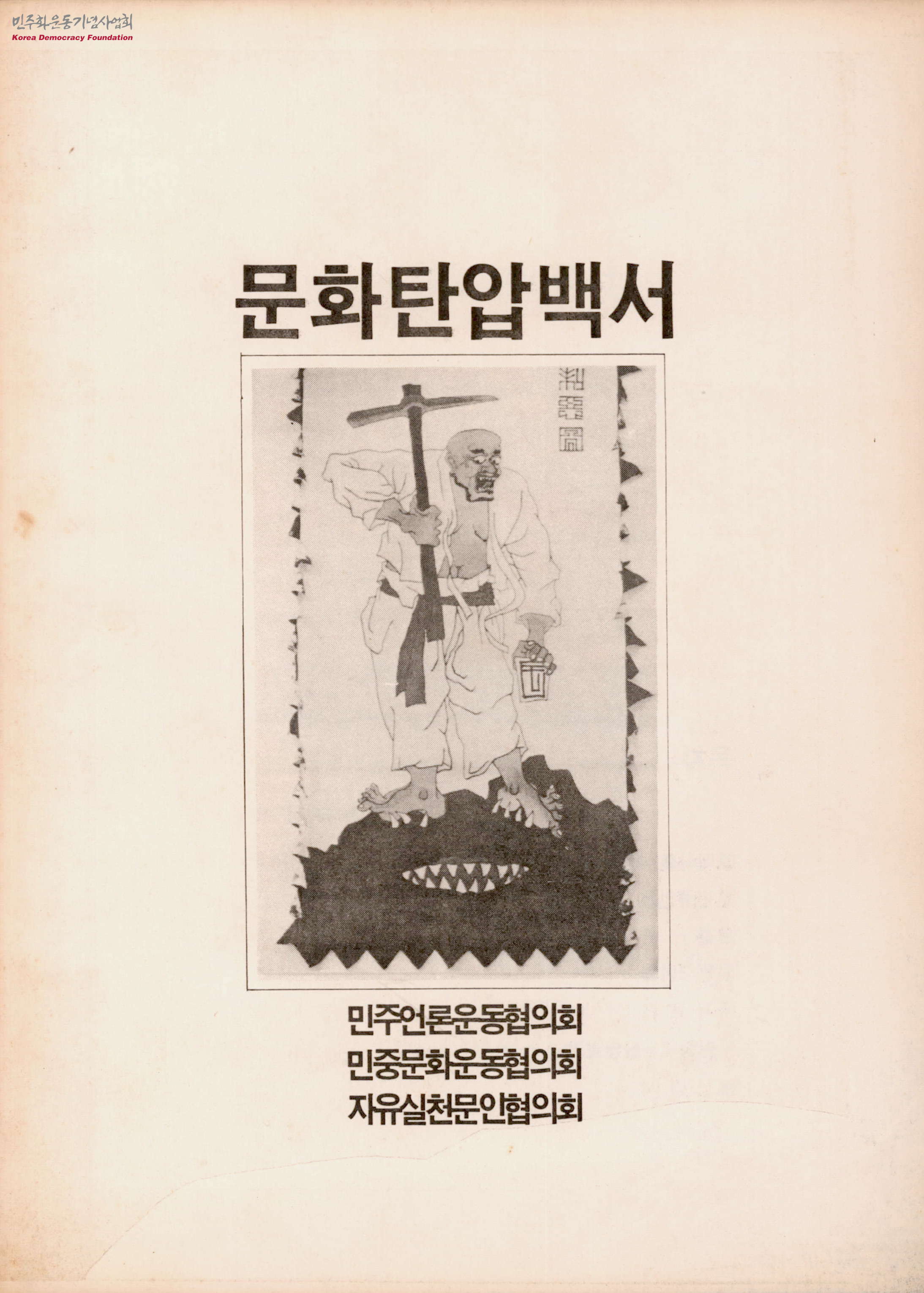 - 1985년 당시 군부독재 정권의 민중문화, 민중교육, 민주언론 탄압에 대항하며 재야 3개 단체가 공동으로 발행한 백서로 『민주화의 길』, 『말』지 압수, 《한국미술 20대의 힘》전 출품작 탈취 등 사례 분석, 성명서, 신문기사 내용 등이 수록되어 있음. 백서 출판 후 경찰은 해당 단체들을 압수수색하고 관련자들을 연행하는 등 탄압이 이어짐