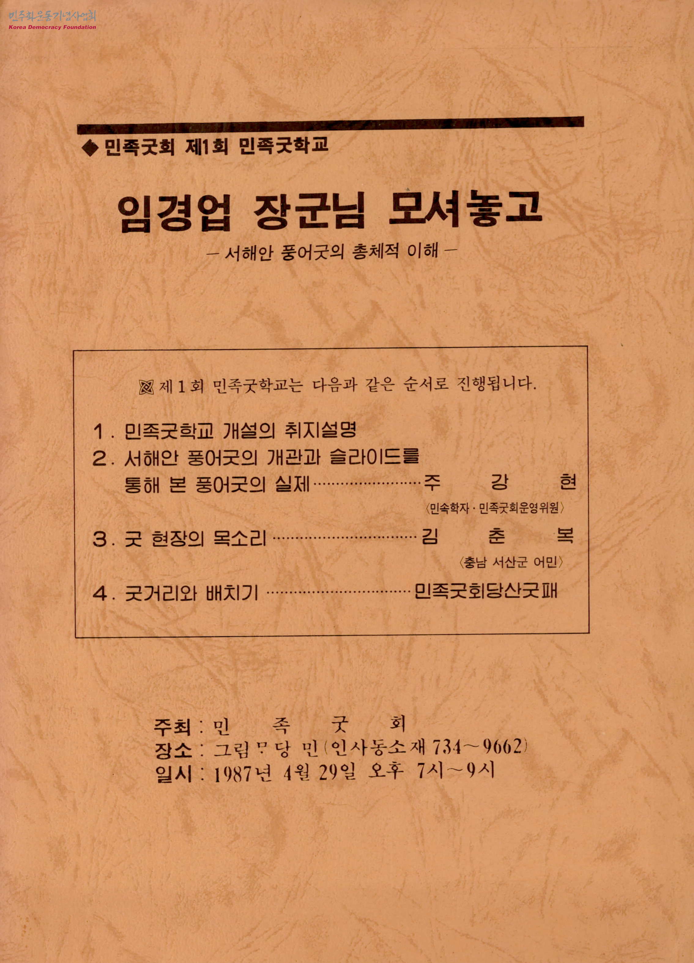 - 1987년 4월 29일 진행한 민족굿회 제1회 민족굿학교의 자료집으로, 민족굿학교 개설의 취지설명, 서해안 풍어굿의 개관과 슬라이드를 통해 본 풍어굿의 실제, 굿 현장의 목소리, 굿거리와 배치기로 구성된 민족굿학교의 강연 내용이 담겨 있음