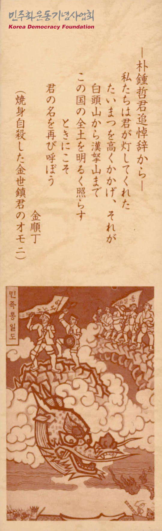 - 김순정 여사의 박종철 추도사를 인용한 유인물로, "우리는 네가 밝힌 횃불을 높이 들어 백두에서 한라까지 이 나라 온 땅을 환하게 밝히리라. 때맞춰 너의 이름을 다시 부른다."라는 내용을 담고 있으며 글귀 하단에는 홍선웅의 〈민족통일도〉(1984)가 삽화되어있음