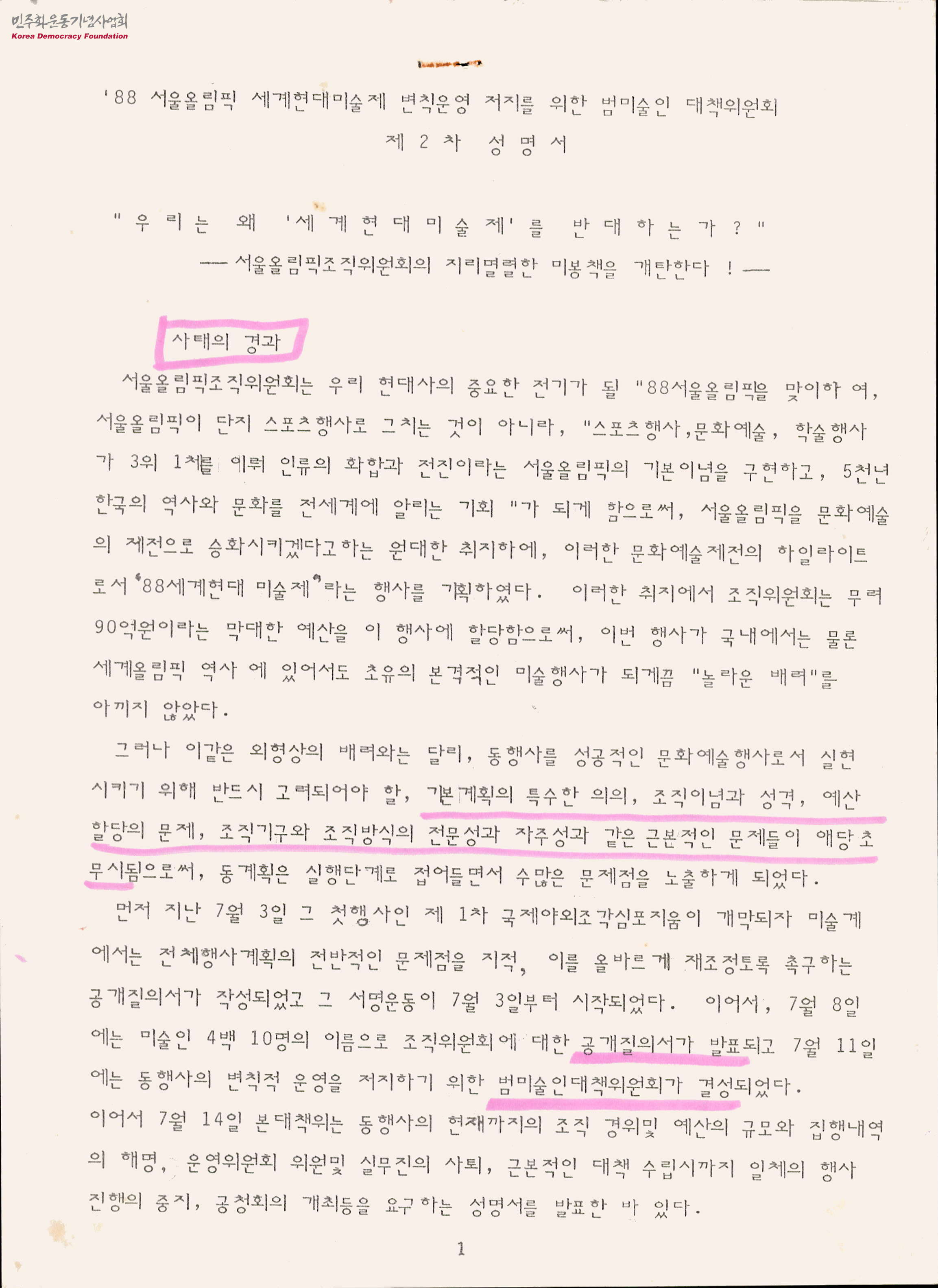 "우리는 왜 '세계현대미술제'를 반대하는가?" - 서울올림픽조직위원회의 지리멸렬한 미봉책을 개탄한다!