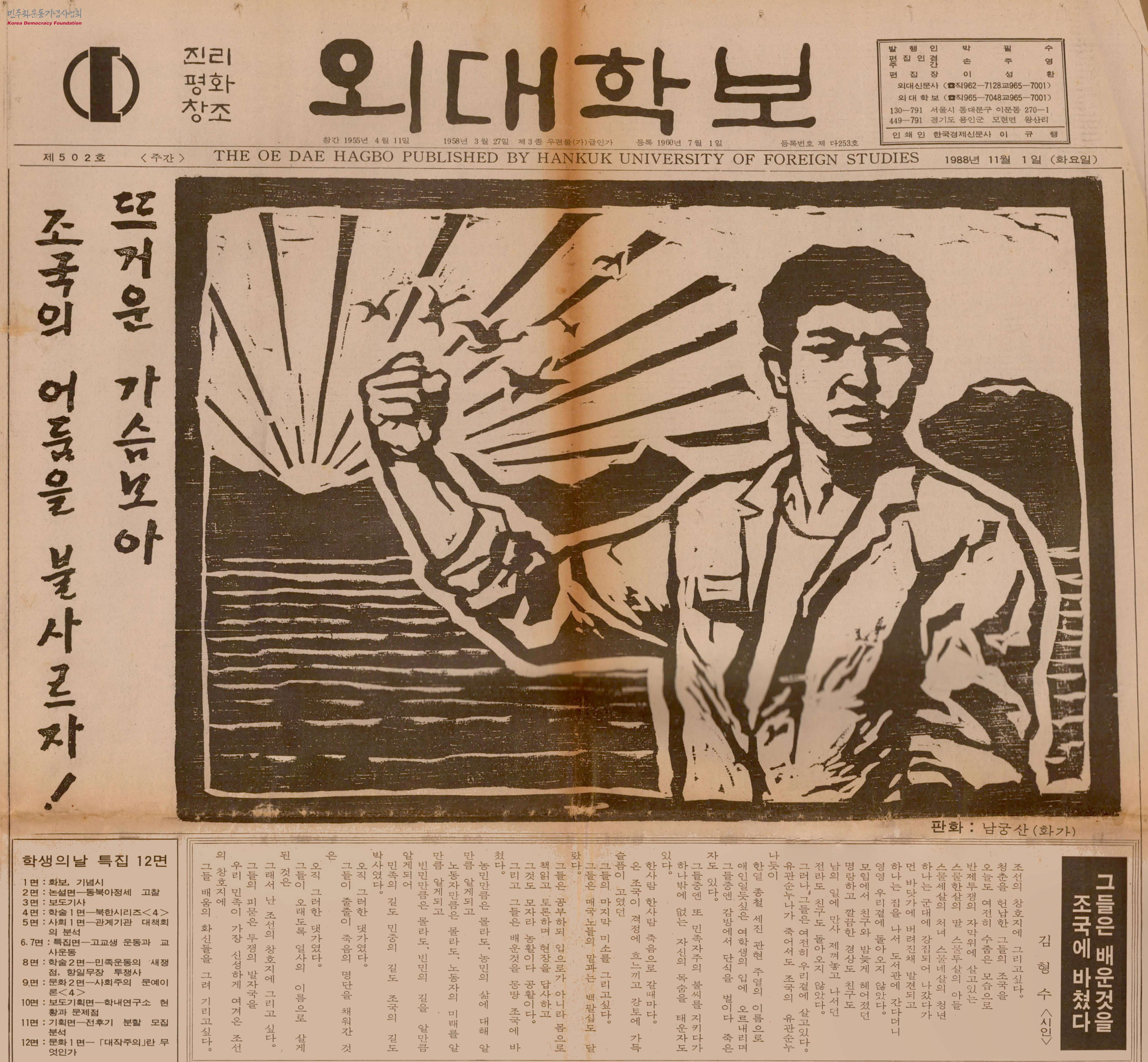 - 1988년 11월 3일 학생의 날 25주년을 기념하여 발간된 한국외국어대학교 소식지 외대학보의 1면으로, 민중미술 판화가 남궁산의 작품이 삽화로 실려있음. 해당 작품에는 한 남성이 떠오르는 해를 배경으로 주먹을 불끈 쥔 모습을 묘사해 투쟁 의지를 형상화함