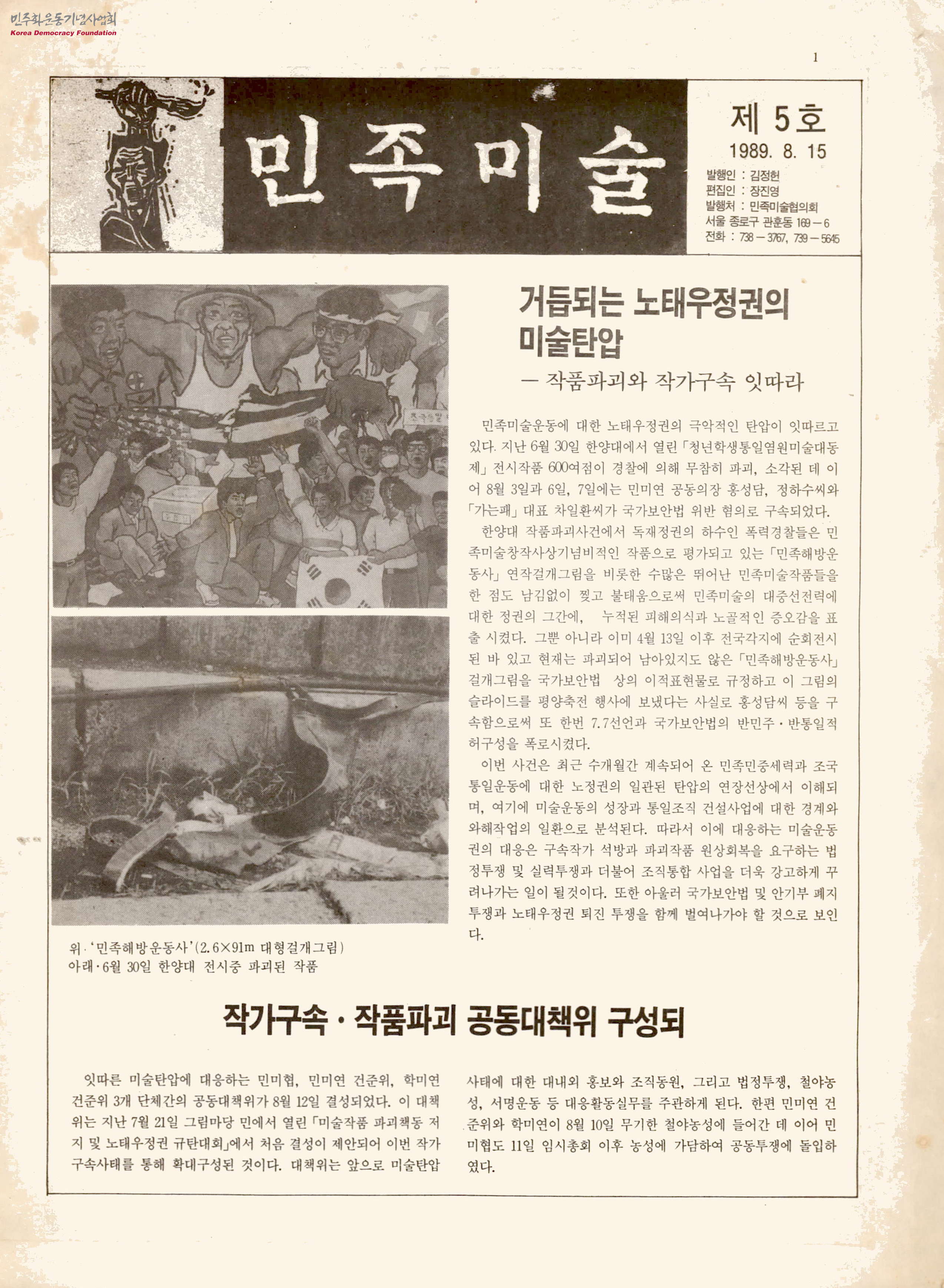 - 《청년학생통일염원미술대동제》 전시작품 소각, 홍성담, 정하수, 차일환 구속 등 민족미술운동 전반에 대한 노태우 정권의 탄압에 대응해 공동대책위를 구성, 정권 퇴진 운동을 전개하겠다는 주요 내용을 담고 있음. 주요 목차는 아래와 같음 - 미술운동 조직통합사업과 현재의 과제 - 탈취된 미술작품 투쟁으로 되찾아 - 둥지 한국피코 연작걸개 등 - 변혁기 미술운동의 성과와 한계를 총집결한 전시 - 《변혁과 반영》전 - 세번째 《여성과 현실》전을 앞두고