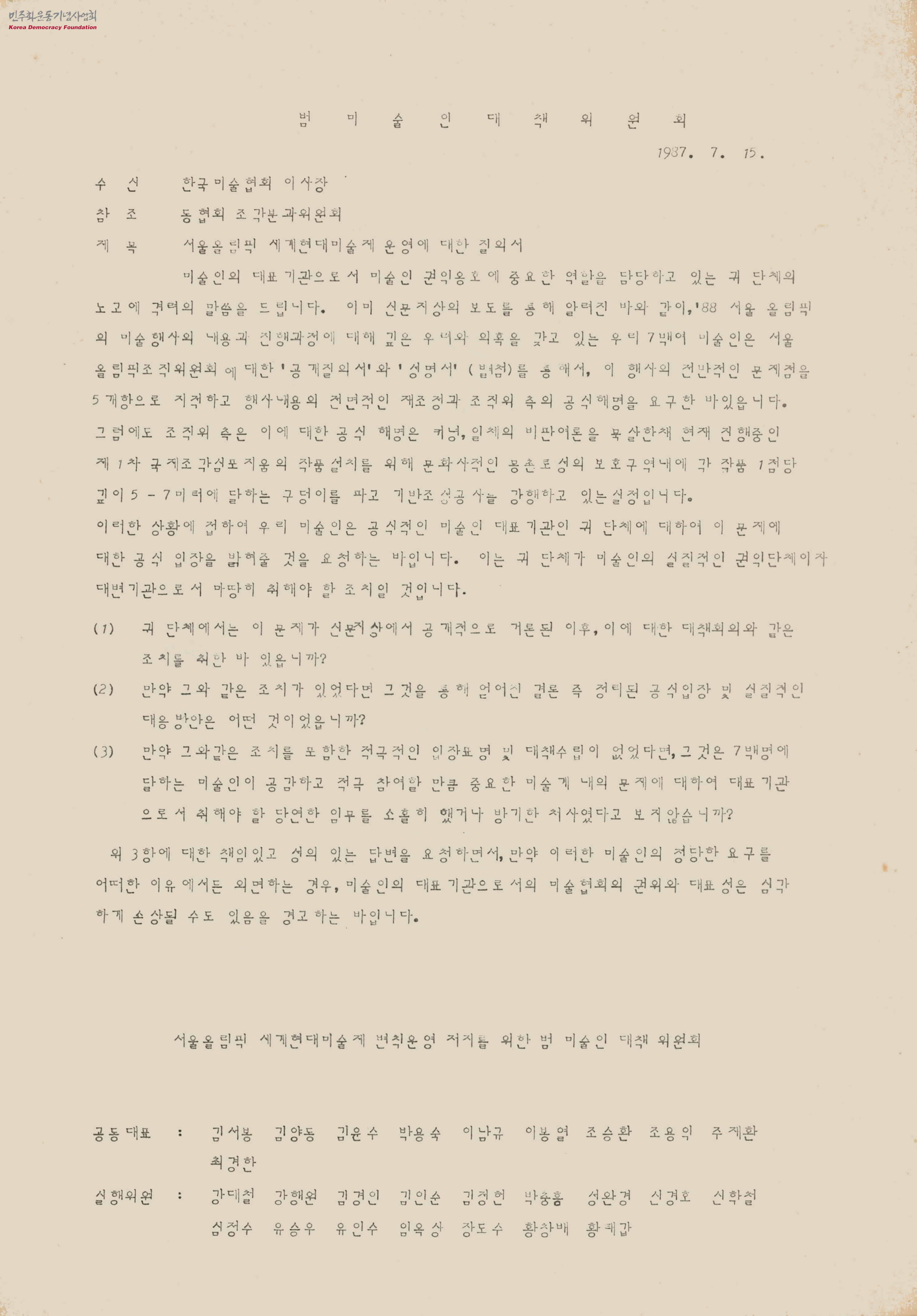 - 서울올림픽 조직위원회 주최 《국제현대회화전》, 《세계야외조각초대전》, 《한국현대미술전》 등 세계현대미술제 기획 과정상 문제 제기에 관련해, 국내 미술인 대표기관으로서 한국미술협회가 어떠한 조치를 취하고 있는지 해명을 요구하는 내용의 문서