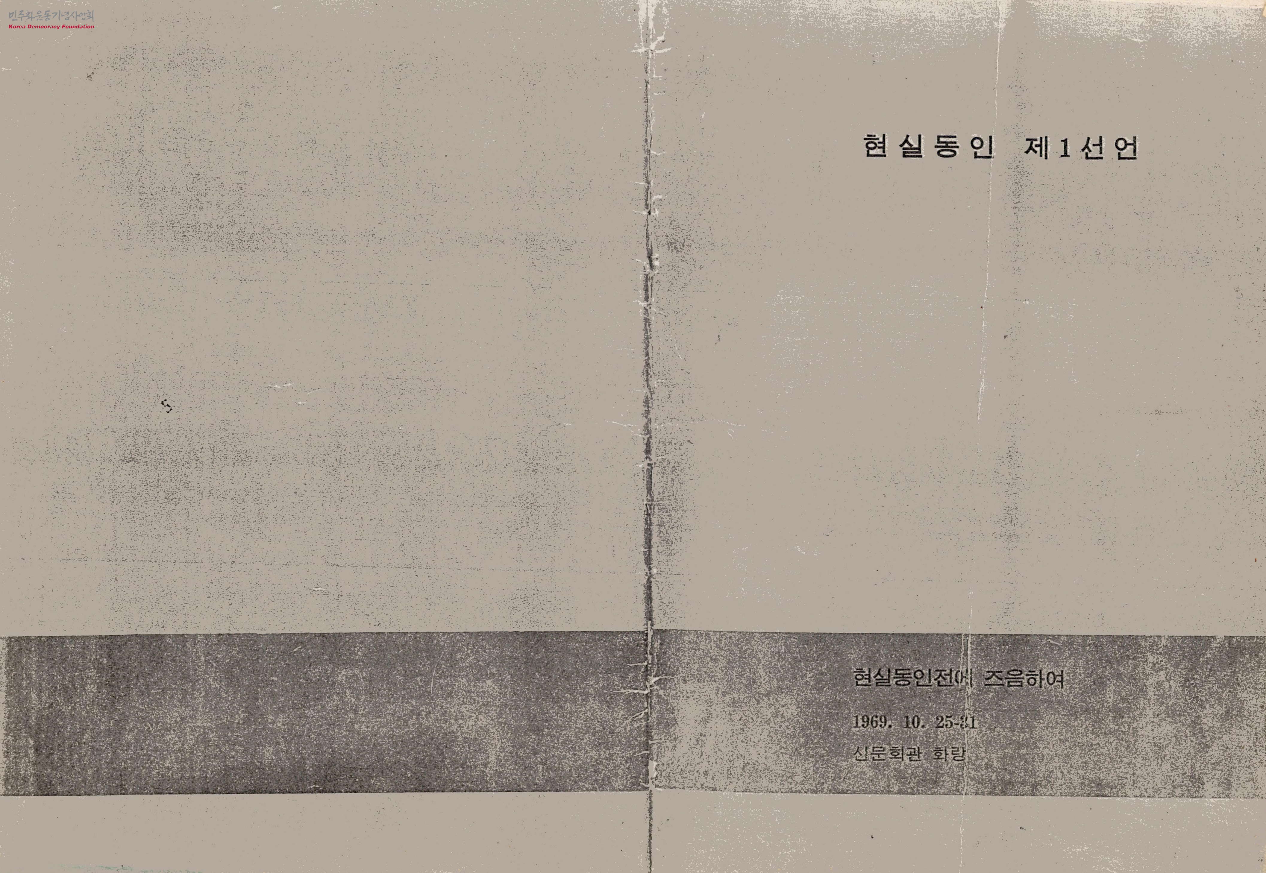 - 현실동인은 연희와 무속 등 민속전통을 의식하고 새로운 민족미술을 창조하고자 형성된 단체로 구성원은 서울대학교 미술대학 동기였던 오윤, 오경환, 임세택을 비롯해 미술평론가 김윤수, 작가 김지하가 있었음 「현실동인 제1선언」은 김지하가 집필하고 김윤수가 감수한 것으로 알려졌으며, 1969년 10월 25~31일 간 신문회관 화랑에서 열릴 예정이었던 《현실동인전》이 무산된 뒤 발표됨. 선언문은 현실주의 미술의 필요성과 당위성을 주장하는 내용을 담고 있음. 이 선언문은 훗날 1979년 '현실과 발언'을 위시한 1980년대 민중미술 이념과 조직의 원류로 평가됨