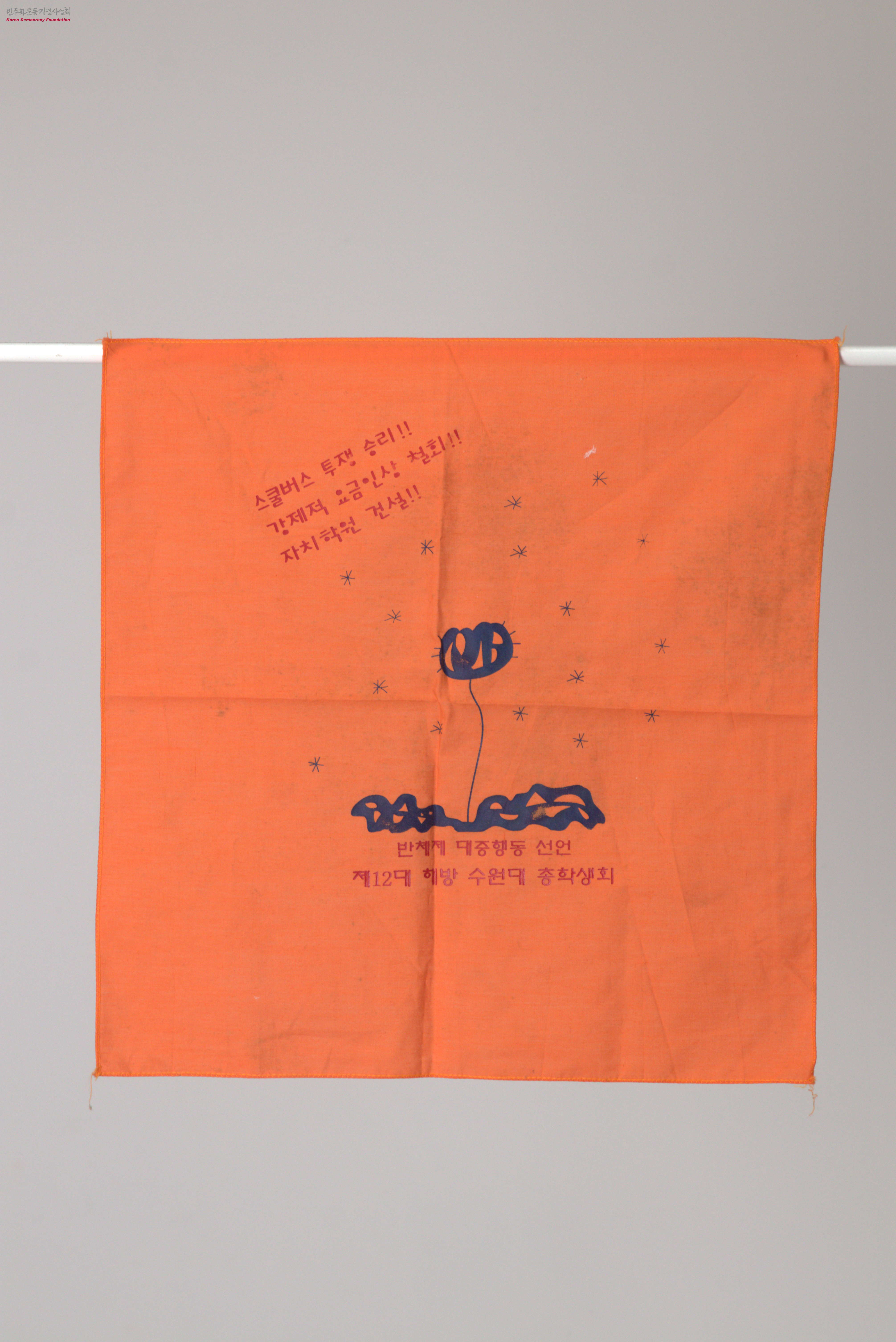 - 제12대 해방 수원대 총학생회 기념 손수건으로, 스쿨버스의 강제적 요금인상 철회 및 자치학원 건설을 위한 반체제 대중행동 선언 내용이 담겨 있음