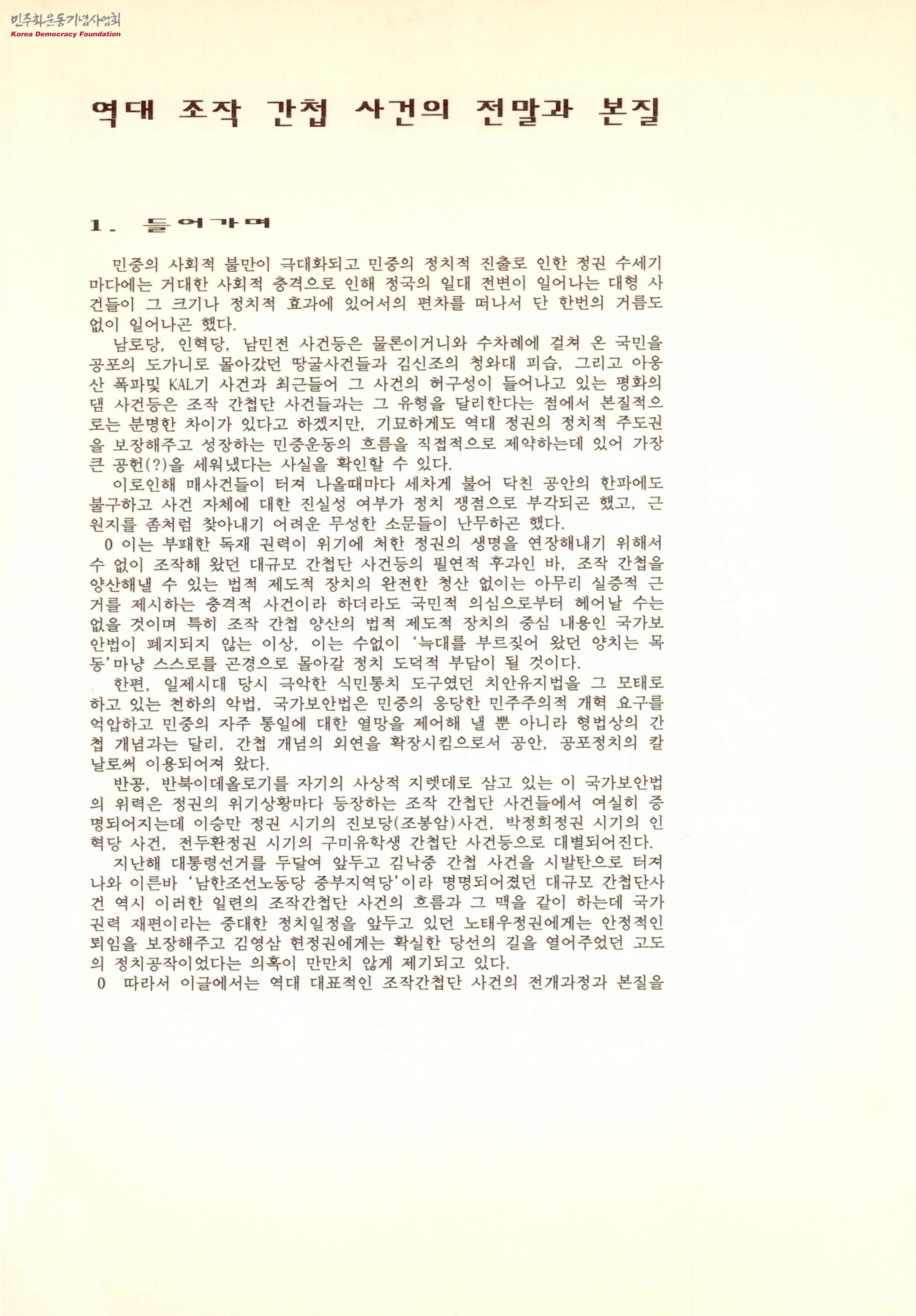 - 국가보안법과 같은 악법은 수많은 정치범, 조작 간첩을 만들어 냈는데, 정치적으로 사용되는 위 법은 정권의 안정을 유지하기 위한 수단으로 사용되고 있음. 이 문서는 국가보안법의 위헌적 성격, 간첩 조작의 실상에 대해 정리한 글로, 조봉암과 진보당 사건, 동백림 사건, 인민혁명당 사건, 서승 서준식 형제의 재일동포 유학생 간첩단 사건, 남조선 민족해방 전선 준비위원회 사건, 구미 유학생 간첩단 사건, 남한조선노동당 중부지역당 사건 등의 사례를 근거로 제시하고 있음