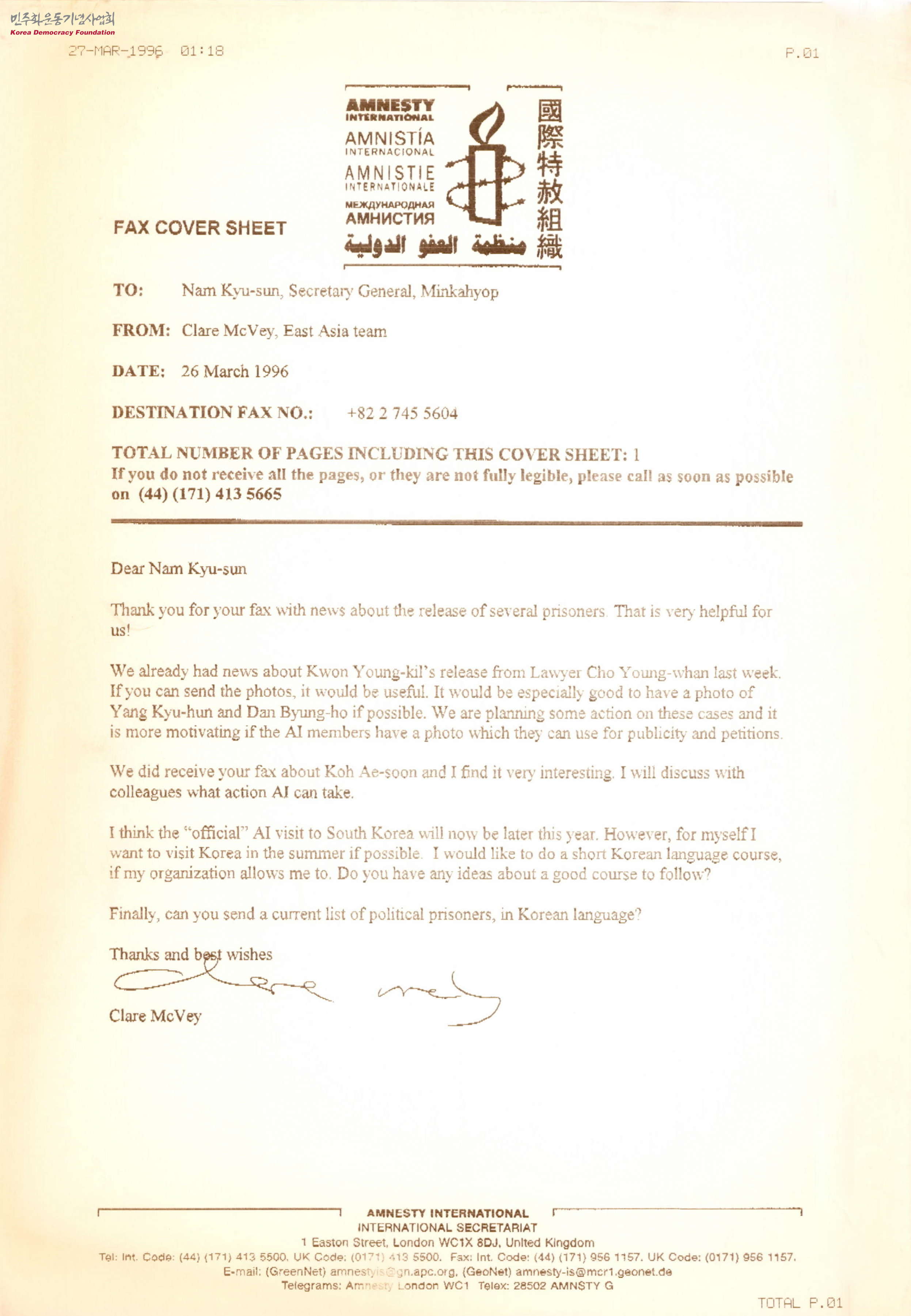 - Clare McVey, East Asia team은 조영환 변호사로부터 권영길씨의 석방 소식을 들었으며, 권영길, 양규헌, 단병호씨의 사진을 보내준다면 이들 사건에 대한 조치와 홍보, 청원 활동에 큰 도움이 될 것이라는 내용, 고애순씨 사건에 어떤 조치를 할 수 있을지 내부 의논 중이라는 내용, 여름에 한국을 방문하기 전 짧은 한국어 코스를 수강하고 싶으니 좋은 코스를 추천해 주길 바란다는 내용, 한국어로 된 정치범들의 최신 목록을 보내달라는 내용 등의 내용이 담긴 문서