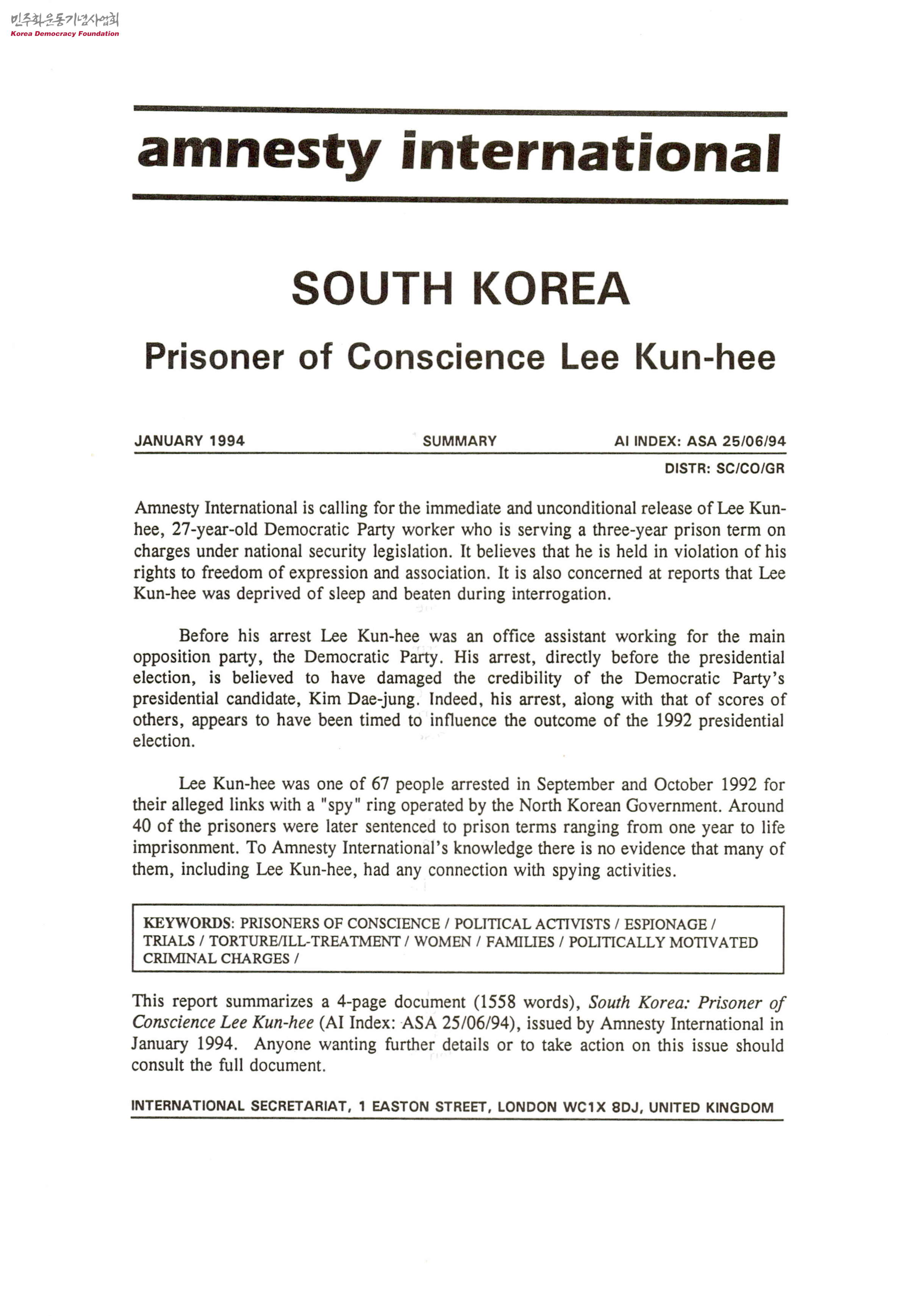 - 이건희씨는 국가보안법 위반 혐의로 3년 형을 선고받고 복역 중에 있는데, 그는 체포되기 전 민주당의 사무보조원으로 일하였으며, 그의 체포는 당시 대선 후보 김대중의 신뢰도를 떨어뜨리고자 정치적으로 조작된 일로 보임. 이건희씨가 간첩 활동을 하였다는 명확한 증거는 밝혀지고 있지 않기에 앰네스티 인터내셔널은 그를 즉각 석방할 것을 요구한다는 내용 등이 담긴 문서