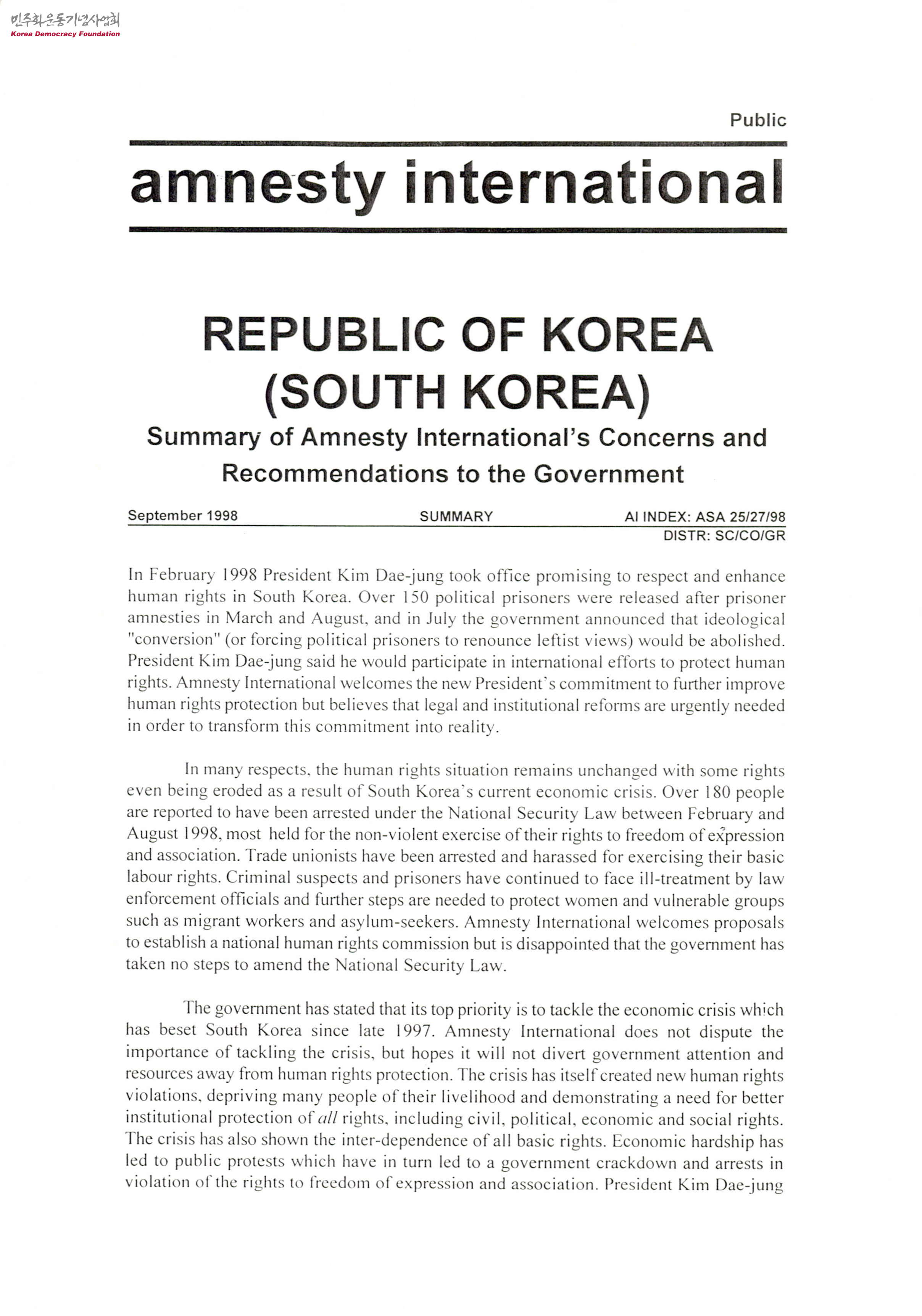 - 1998년 2월 김대중 대통령은 대한민국의 인권을 강화하겠다고 약속하며 취임하였고, 3월과 8월 150명 이상의 정치범을 사면, 7월에는 이념 전향 제도를 폐지할 것이라 밝힌 바 있음. 김대중 대통령은 인권 보장을 위해 국제적 노력을 다하겠다고 밝히었으나, 앰네스티 인터내셔널널은 김대중 대통령이 공약을 실현하기 위해서 법·제도적 개혁이 필요할 것으로 보고 있다는 내용 등이 담긴 문서