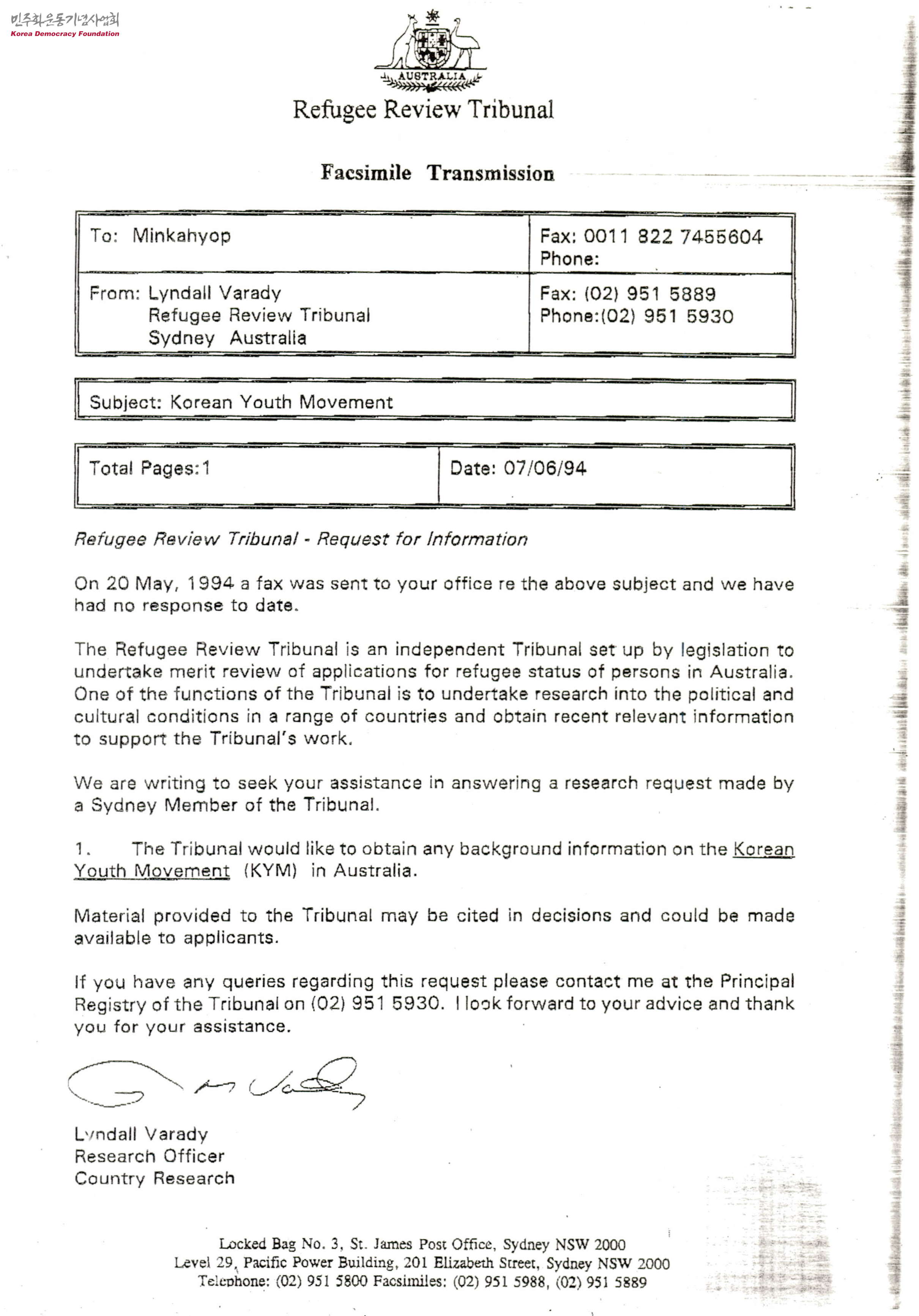 - 1994년 5월 20일 한국 청년 운동을 주제로 민가협에 팩스를 보냈지만 지금까지 아무런 답변이 없어 다시 보내며, 호주에서의 한국 청년 운동에 대한 정보를 얻고 싶으니 이와 관련하여 아는 바가 있으면 답변 바란다는 내용 등이 담긴 문서