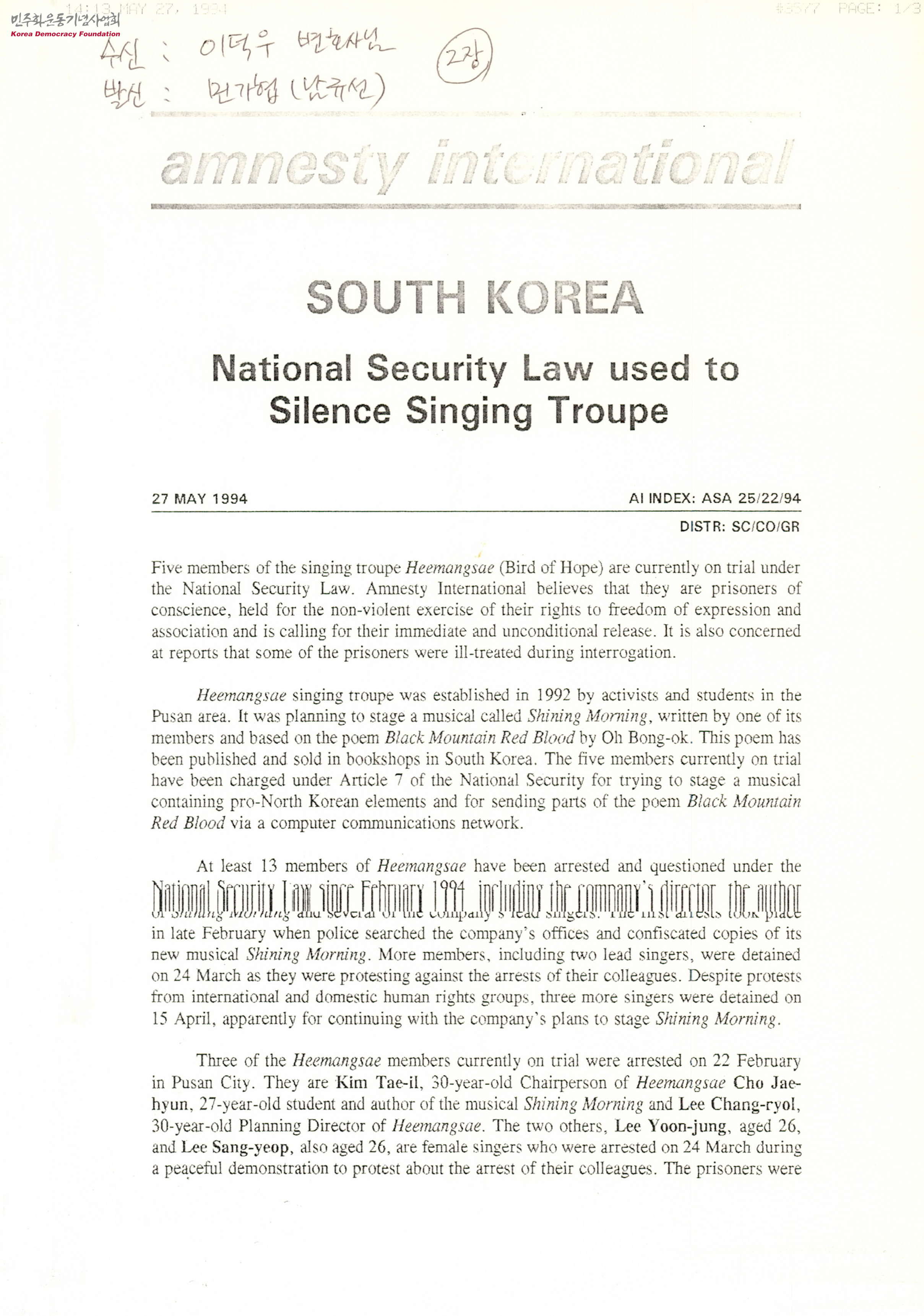 - 희망새' 가창단 회원 5명은 국가보안법에 따라 재판을 받고 있는데, 앰네스티 인터내셔널은 이들이 표현과 결사의 자유에 대한 권리를 비폭력적으로 행사한 혐의로 구속된 양심수라고 생각하여 즉각적이고 무조건적인 석방을 요구한다는 내용 등이 담긴 문서
