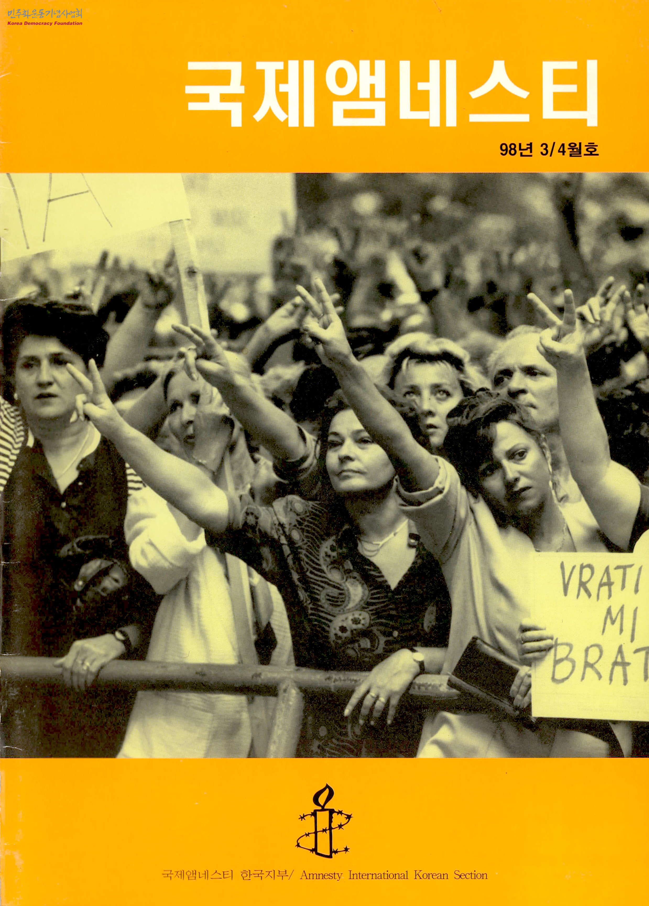 - 1998년 3월 2일 국제앰네스티 한국지부에서 발행한 소식지 98년 3/4월호로, 1991년 8월 유고슬라비아 군본부 앞에서 평화적으로 시위하는 군가족들의 모습이 담긴 사진이 표지를 장식하고 있으며, 목차는 다음과 같음 - 논설 망할놈의 돈 - 집중기획 아직도기다려야하는가?-여성의 인권을 위한 투쟁 - 특집 인터뷰: 중국의 양심수 웨이 징성 고독한 비판가, 웨이 징성 웨이 징성이 보내온편지 - 세계인권선언 50주년 캠페인 세계인권선언: 절대美의 인정 세계인권선언의 배경과 의미 나의 권리 알기: 세계인권선언문 - 지금 세계는 멕시코: 우리는 평화를 원한다 에디오피아: 테러 분자로 기소된 인권 운동가 이집트: 여성 할레를 금지시키다 - 사형 약물주입에 의한사형 미국: 텍사스여 사형수형집행 세계인권선언 50주년과 인권교육