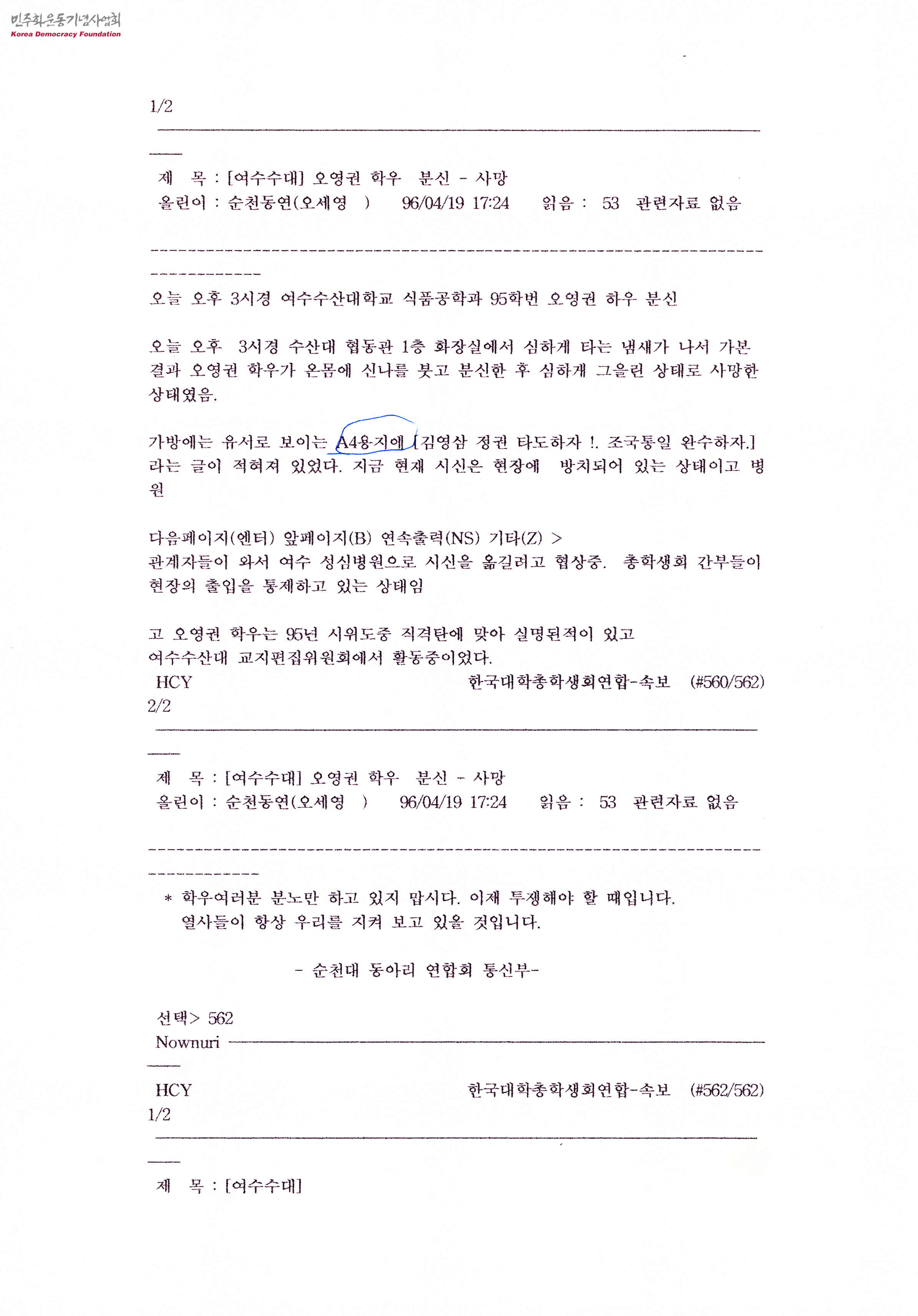 - 1996년 4월 19일 여수수산대학교 협동관 1층 화장실에서 심하게 타는 냄새가 나서 가본 결과 오영권 학우가 온몸에 신나를 붓고 분신한 수 심하게 그을린 상태로 사망한 것을 발견하였고, 가방에는 유서로 보이는 A4용지에 '김영삼 정권 타도하자!, 조국통일 완수하자'라는 글이 적혀 있었으며, 현재 시신은 현장에 방치되어 있는 상황에 병원 관계자들이 여수 성심병원으로 옮기려 협상중에 있다는 내용 등이 담긴 인터넷 글 모음