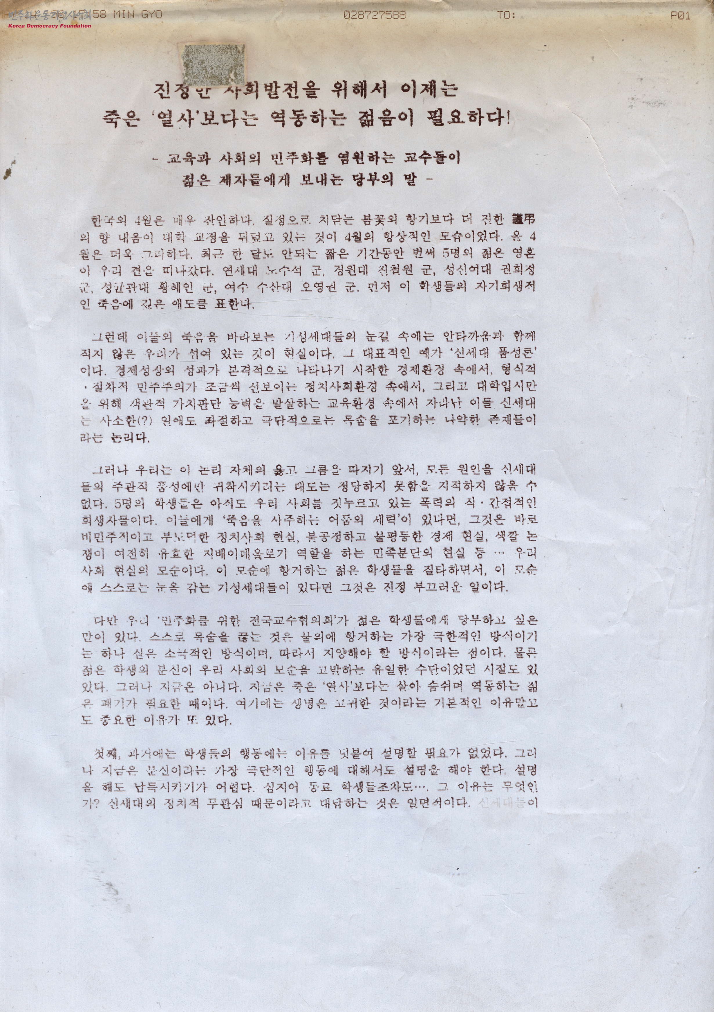 - 1996년 4월 동안만 벌써 5명의 젊은 학생들이 우리 곁을 떠났는데, 연세대학교 노수석 군, 경원대학교 진철원 군, 성신여자대학교 권희정 양, 성균관대학교 황혜인 양, 여수수산대학교 오영권 군 등이 이에 해당함. 이들의 죽음이 매우 안타깝고 영령 앞에 애도를 표하는 바이지만, 모순적인 삶을 바꾸기 위해서는 계속 살며 꾸준히 이를 바꾸고자 노력함이 중요한데, 이처럼 목숨을 끊는 일은 언뜻 불의에 항거하는 극한적인 방식으로 보이긴 하나 사실은 소극적인 방식이며, 진정한 민주화를 위해서는 미래를 위해 끊임없이 주장을 펼쳐 나가야 한다는 내용 등이 담긴 당부의 글