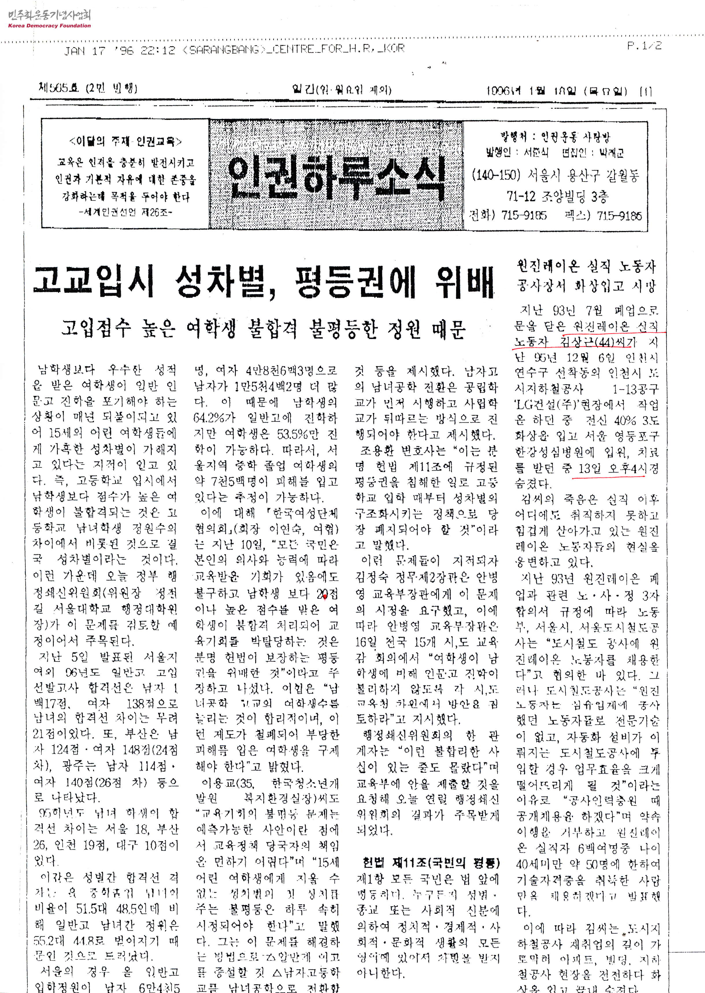 인권하루소식 1996년 1월 제565호