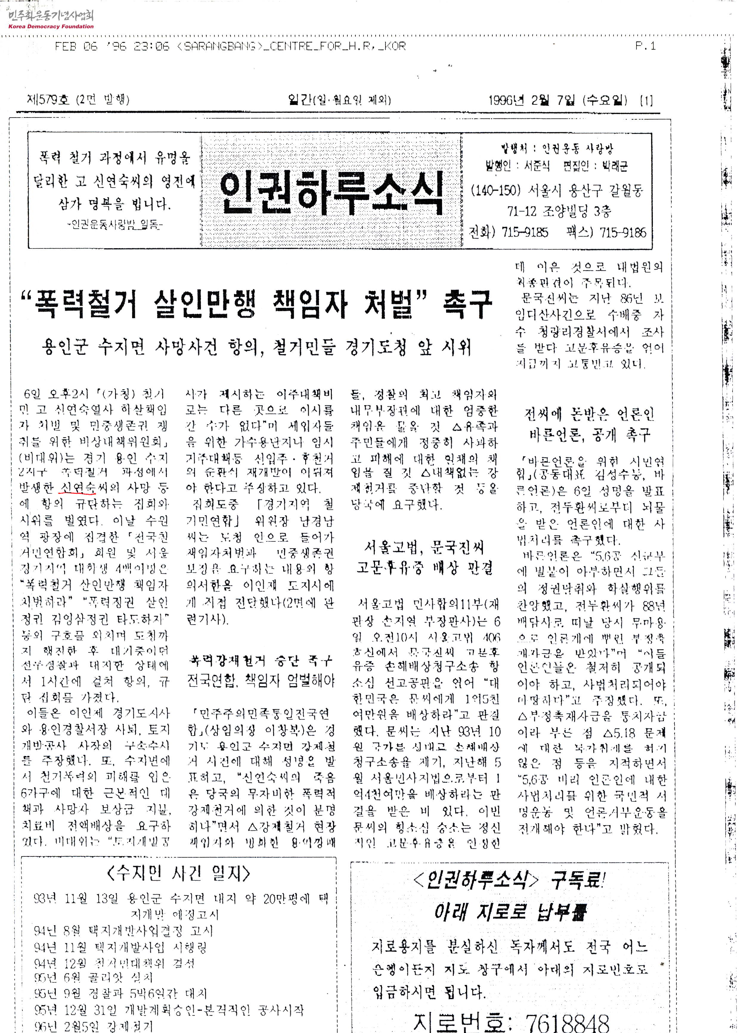인권하루소식 1996년 2월 제579호