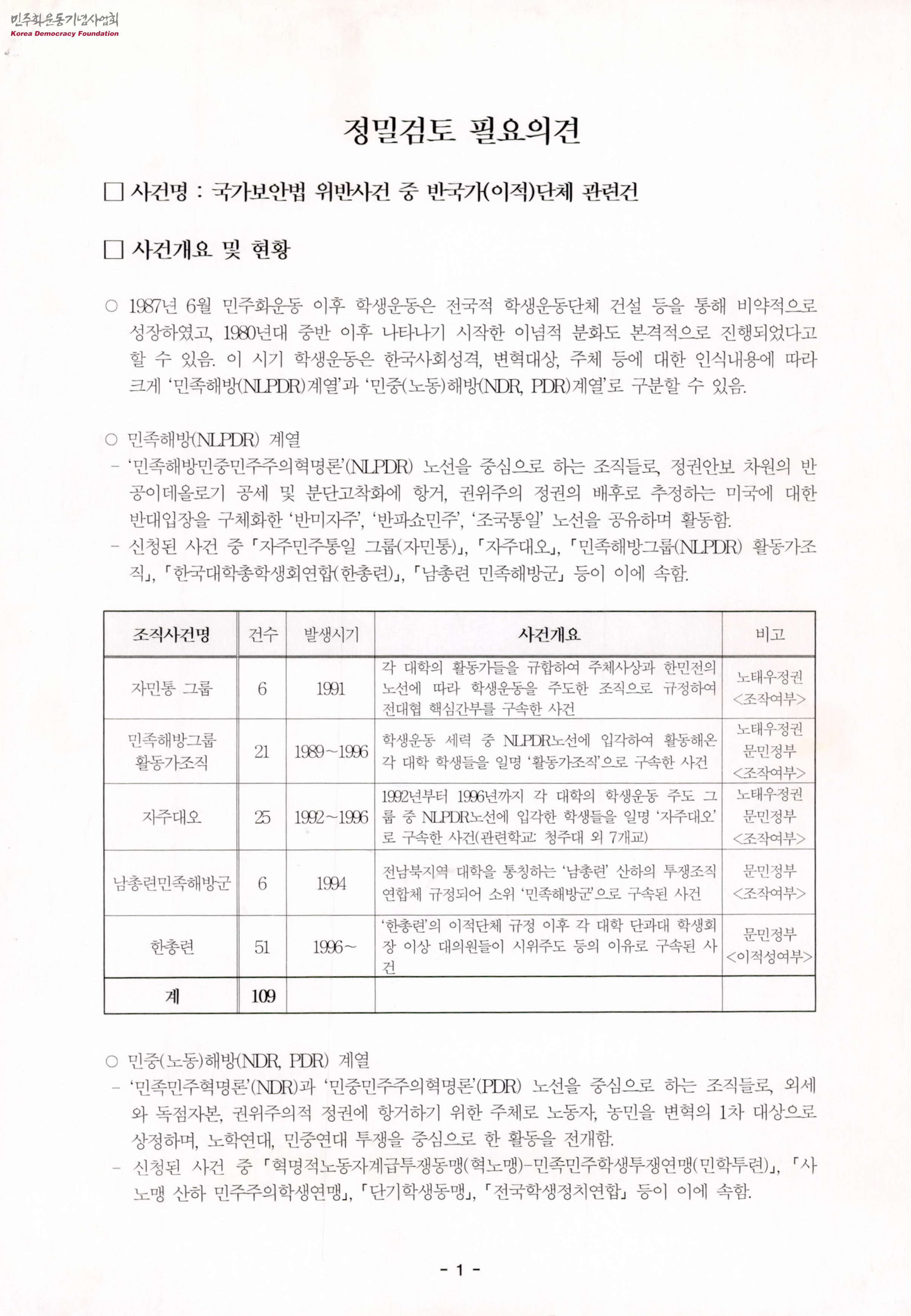 - 국가보안법 위반사건 중 반국가(이적)단체 관련 건의 정밀검토 필요의견서로 1987년 6월 민주화운동 이후 학생운동이 1980년 중반 이후 이념적 분화가 진행되었고, 이것이 민족해방계열과 민중해방계열로 나눠지며 이 사건들에 대한 정밀검토 필요성, 처리계획 등이 담겨있음