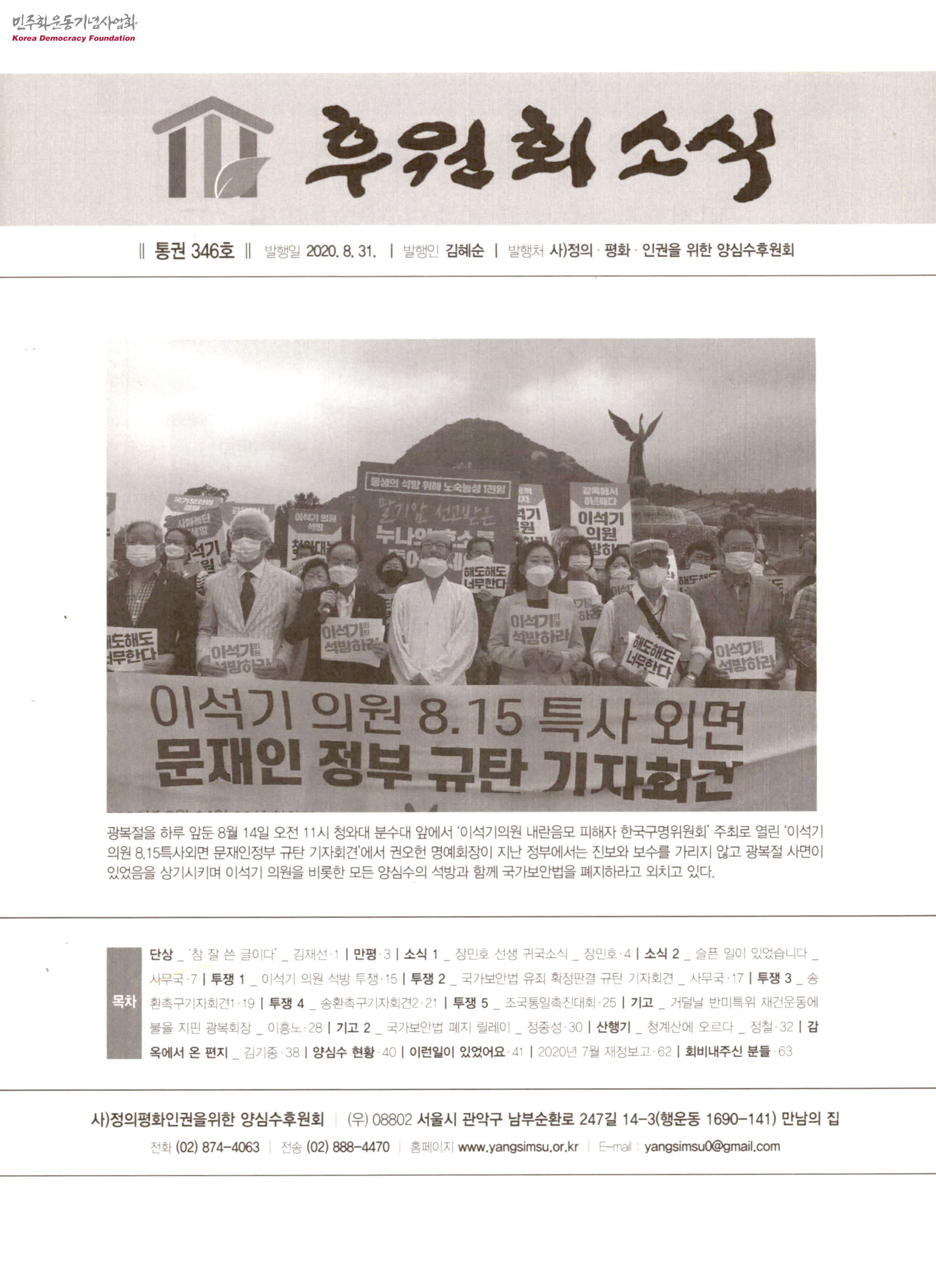 - 2020년 8월 31일 정의, 평화, 인권을 위한 양심수후원회에서 발간한 소식지 통권 346호 목차는 다음과 같이 구성되어 있음 - 단상 / '참 잘 쓴 글이다' - 만평 - 소식1 / 장민호 선생 귀국소식 - 소식2 / 슬픈 일이 있었습니다 - 투쟁1 / 이석기 의원 석방 투쟁 - 투쟁2 / 국가보안법 유죄 확정판결 규탄 기자회견 - 투쟁3 / 환촉구지자회견 - 투쟁4 / 송환촉구기자회견2 - 투쟁 5 / 조국통일촉진대회 - 기고 / 거덜날 반미특위 재건온동에 불을 지핀 광복회장 - 기고 2 / 국가보안법 폐지 릴레이 - 산행기 / 청계산에 오르다 - 감옥에서 온 편지