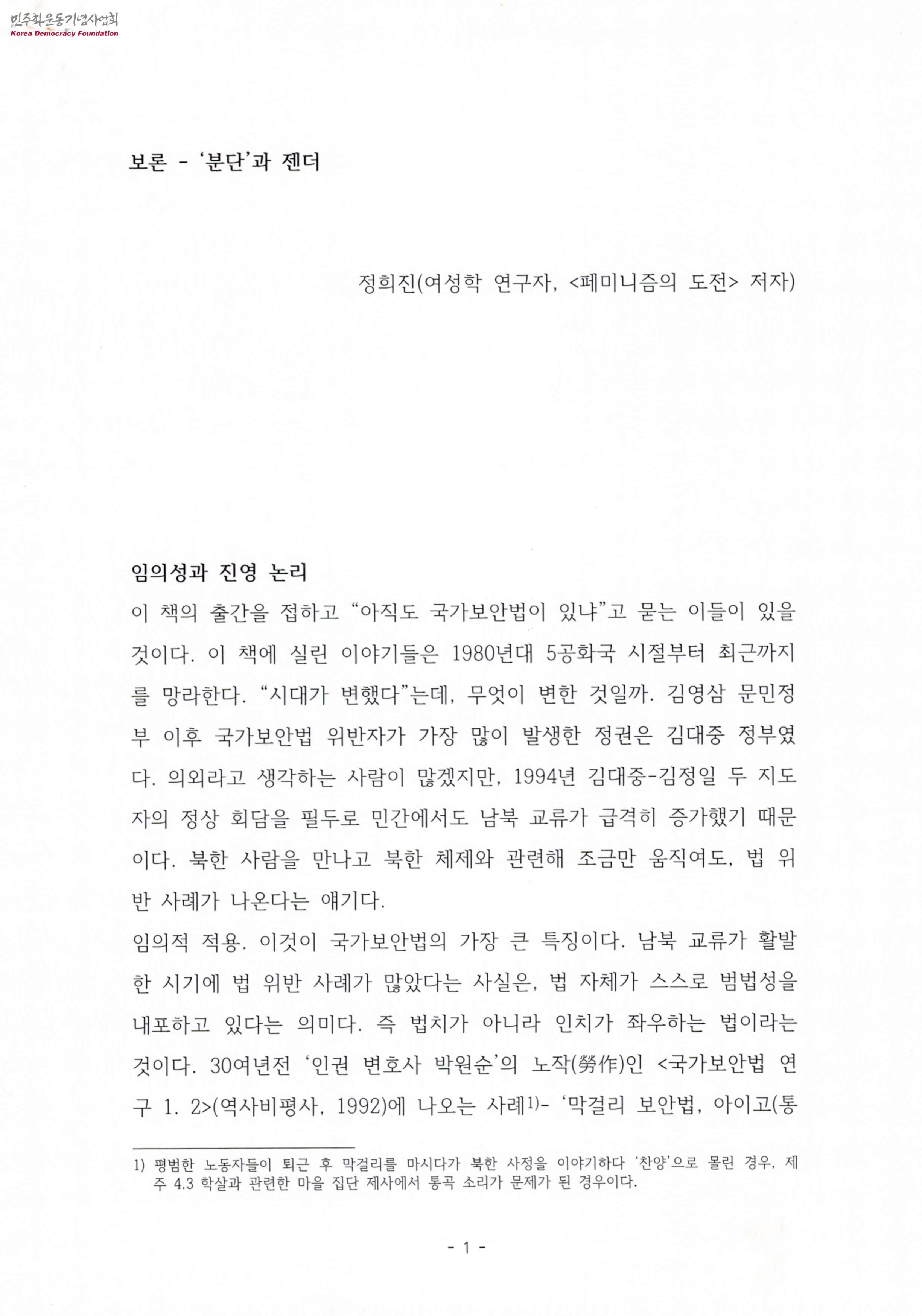 - 여성학 연구자 정희진이 쓴 보론-'분단'과 젠더 발제문으로 국가보안법을 페미니즘의 관점에서 비판하였으며 발제문은 국가보안법의 임의성과 진영 논리, 저자의 책 <국가보안법과 젠더>에서 다루는 모성의 평화정치학, 안전의 성별성, 국가의 안보는 없다, 국가안보와 식민지 남성성 등으로 구성되어 있음