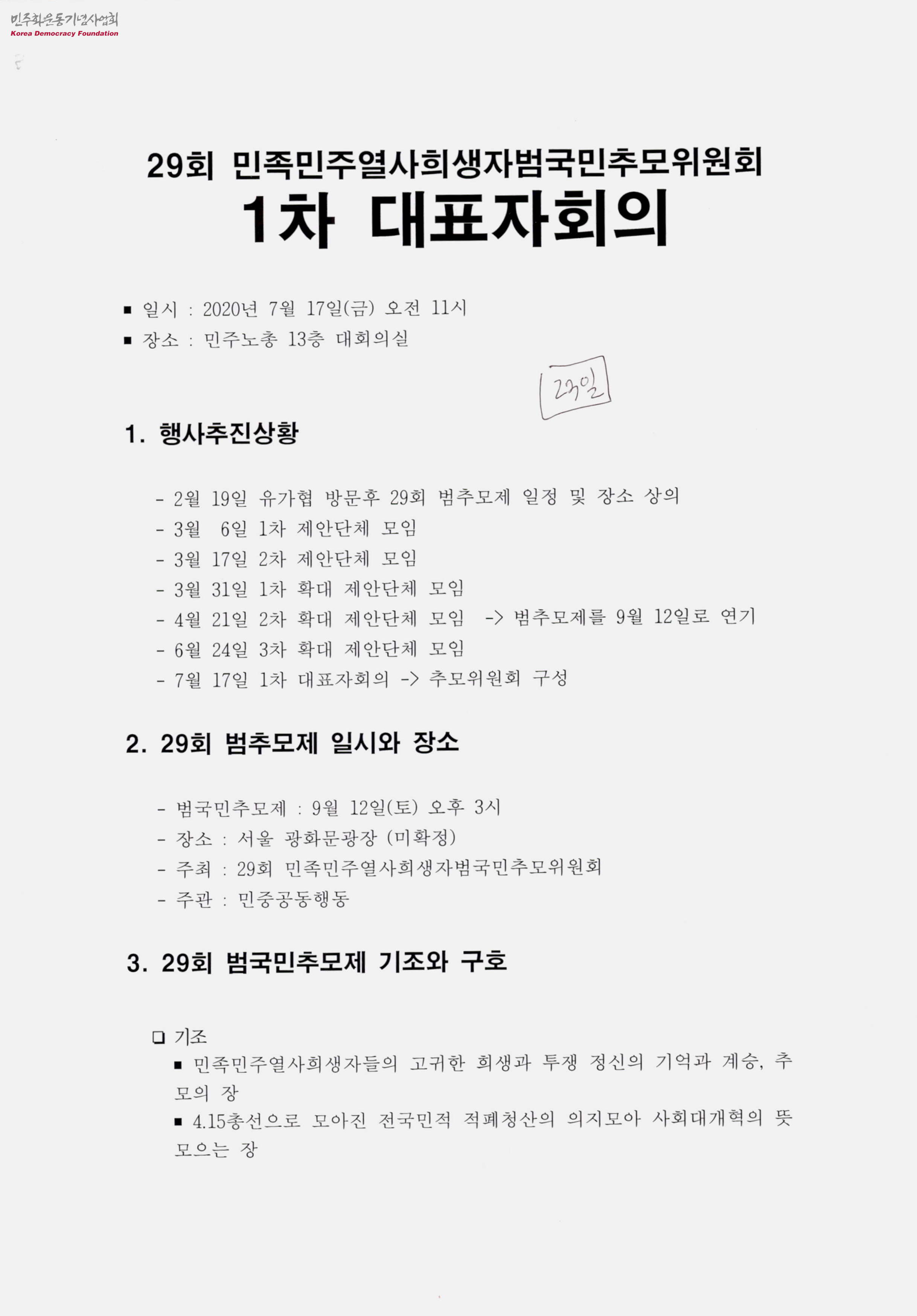 - 2020년 7월 17일 민주노총 13층 대회의실에서 진행된 29회 민족민주열사희생자범국민추모위원회 1차 대표자회의에 대한 안내로 2월 19일부터 7월 17일까지 행사추진상황, 9월 12일에 서울 광화문광장에서 진행되는 추모제 일시와 장소, 기조와 구호, 위원회 구성 등으로 구성되어 있음