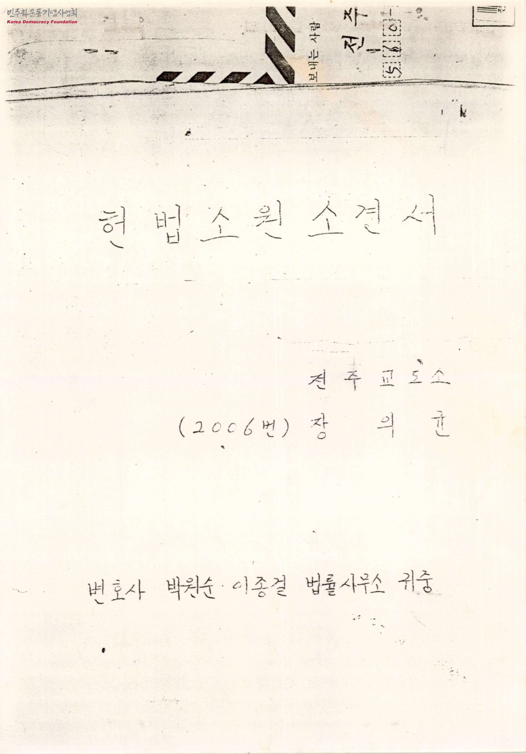 - 전주교도소 장의균이 박원순, 이종걸의 법률사무소로 보낸 헌법소원 소견서로 교도소에서 수형자의 불온사상을 교화해야 하며 취직을 할 수 없다는 차별이 존재하며 조작간첩 행위에 대한 현실을 담고 추신으로 공안사범에 대한 문제를 담고 있는 글