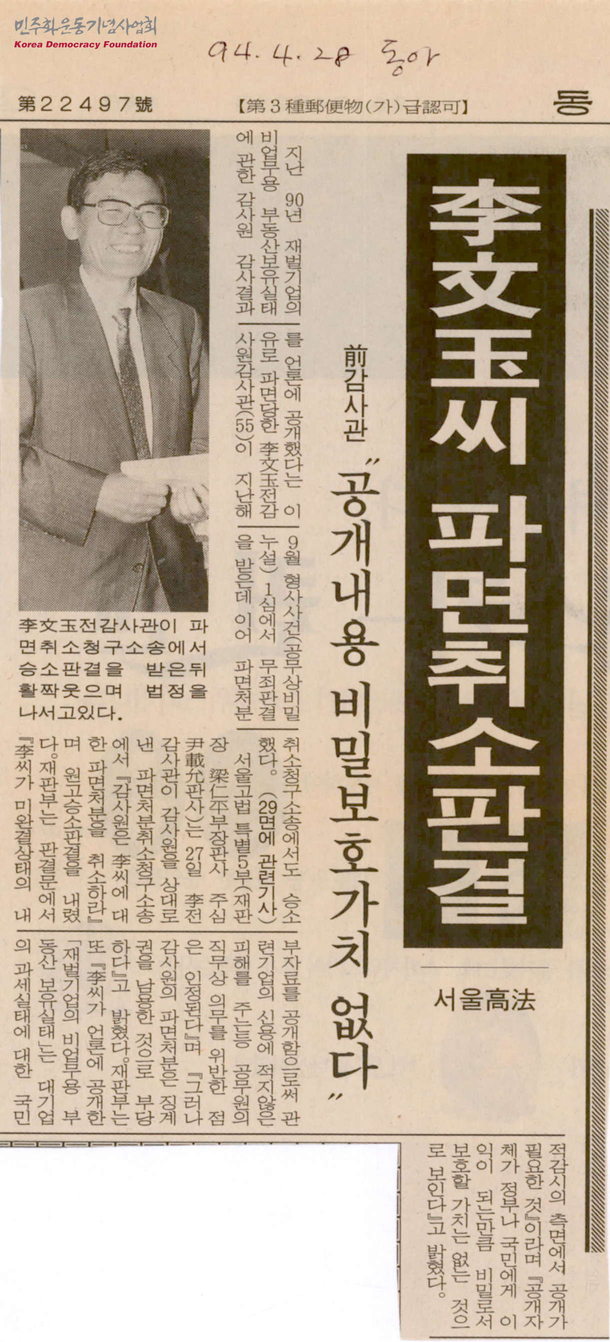 [신문스크랩]李文玉(이문옥)씨 파면취소판결