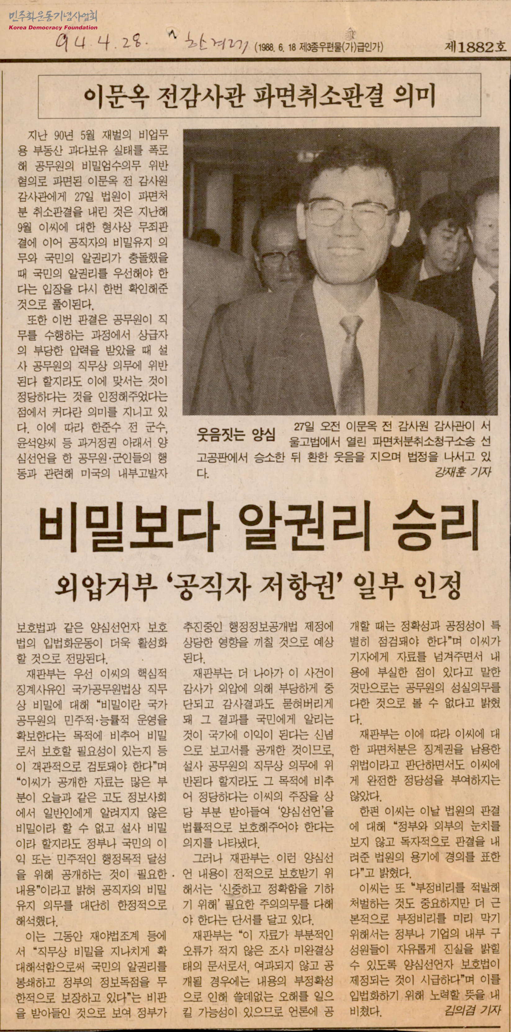 - 90년 5월 재벌의 비업무용 부동산 과다보유 실태를 폭로해 공무원의 비밀엄수의무 위반혐의로 파면된 전 감사원 감사관 이문옥에게 1994년 4월 27일 법원이 파면 처분 취소판결을 내렸고 공직자의 비밀유지 의무와 국민의 알 권리가 충돌했을때 국민의 알 권리를 우선해야 한다는 입장을 확인한 판결이라는 내용의 신문스크랩