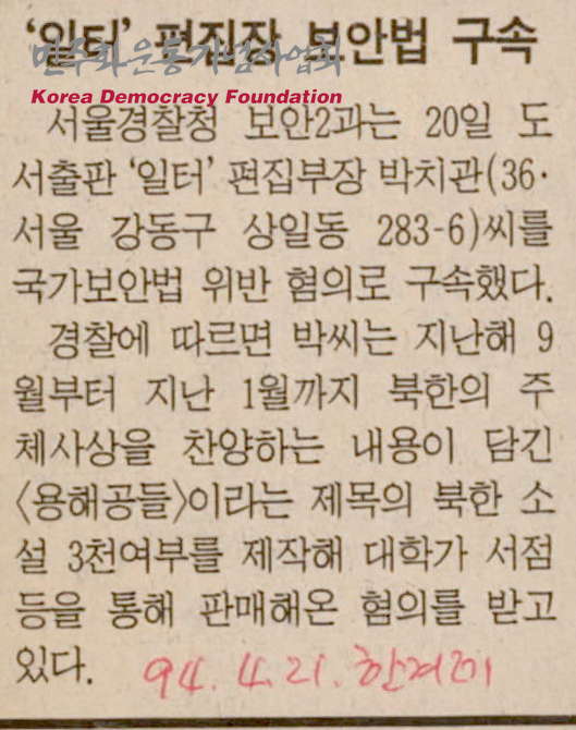 - 서울경찰청 보안 2과에서 1994년 4월 20일 도서출판 '일터' 편집부장 박치관을 국가보안법 위반 혐의로 구속하였다는 기사로 박치관이 1993년 9월부터 1994년 1월까지 북한의 주체사상을 찬양하는 내용이 담긴 <용해공들>이라는 제목의 북한 소설 3천여 부를 제작해 대학가 서점 등을 통해 판매한 혐의가 있다는 내용의 신문스크랩