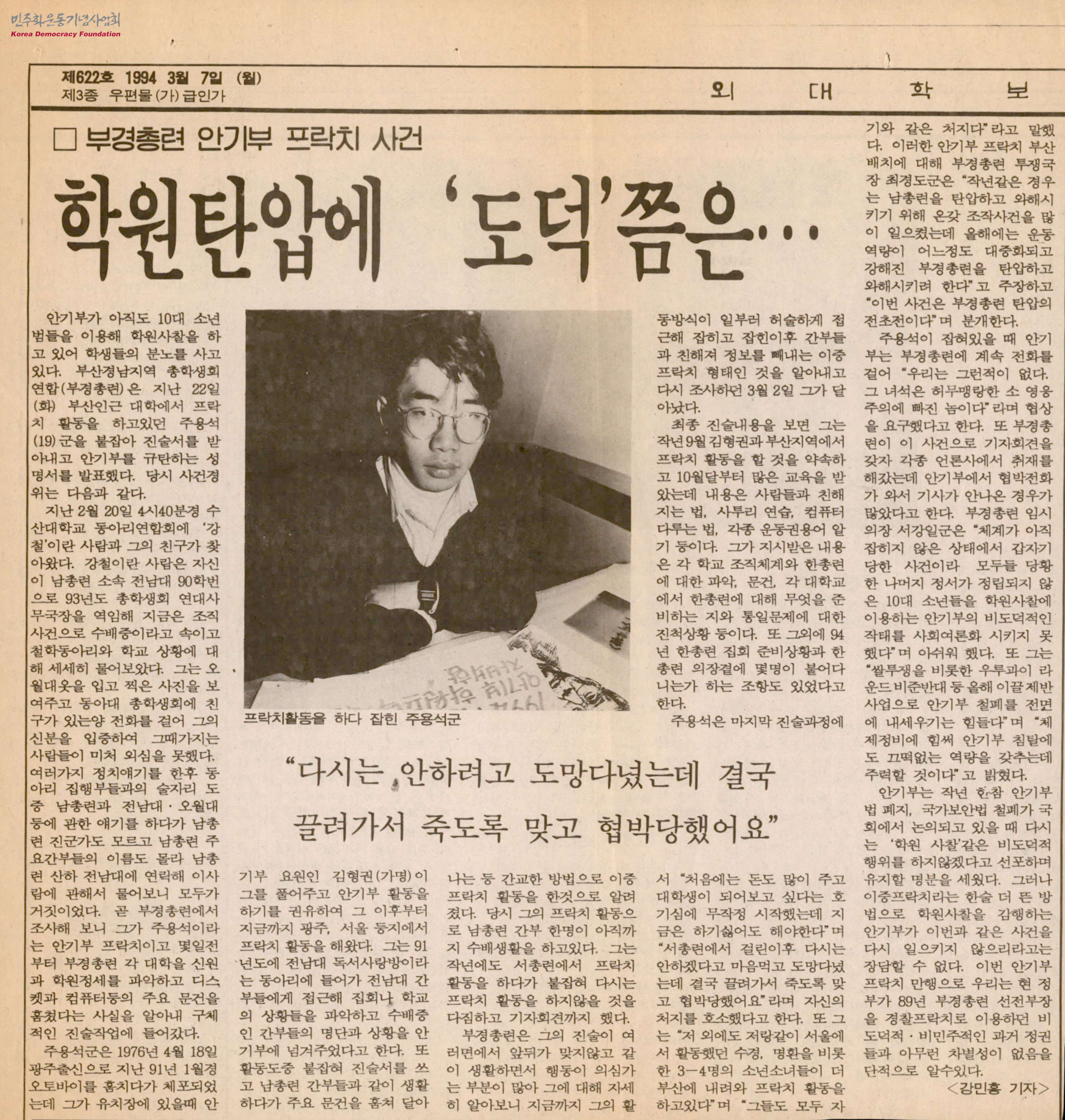 - 안기부가 10대 소년범들을 이용해 학원사찰을 하고 있다는 기사로 부산경남지역 총학생회연합에서 1994년 2월 22일 부산 인근 대학에서 프락치 활동을 하고 있던 학생을 잡아 진술서를 받아내고 안기부를 규탄하는 성명서를 발표했다는 내용의 신문스크랩