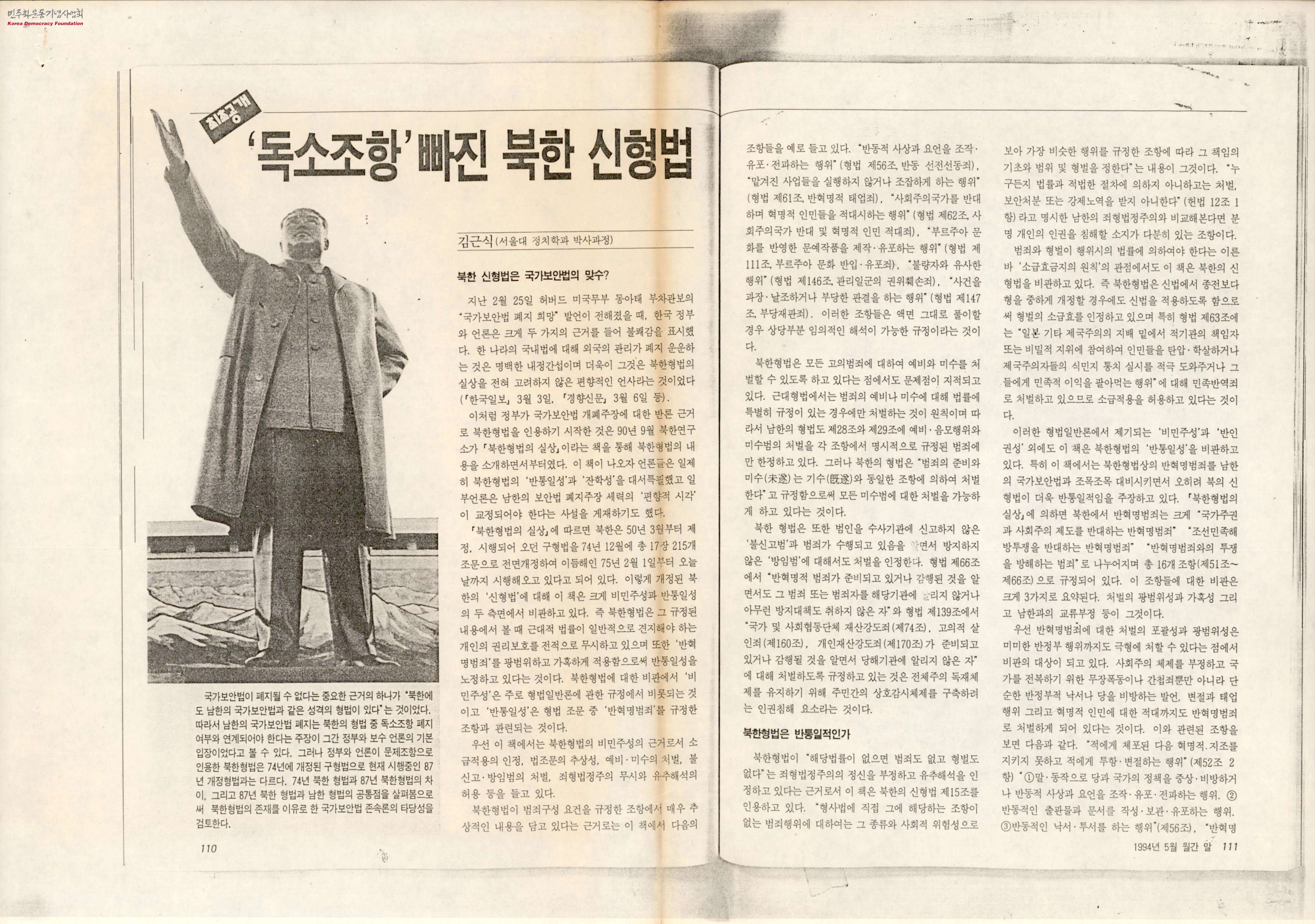 - 서울대 정치학과 김근식의 글로 1994년 2월 25일 허버드 미 국무부 동아태 부차관보의 "국가보안법 폐지 희망" 발언이 전해졌을 때 한국 정부와 언론이 북한형법을 고려하지 않았다는 비판을 내세웠고 이들이 비판하는 북한형법 중 87년 신형법과 74년 형법을 비교하고 국가보안법을 비판하고 있는 신문스크랩