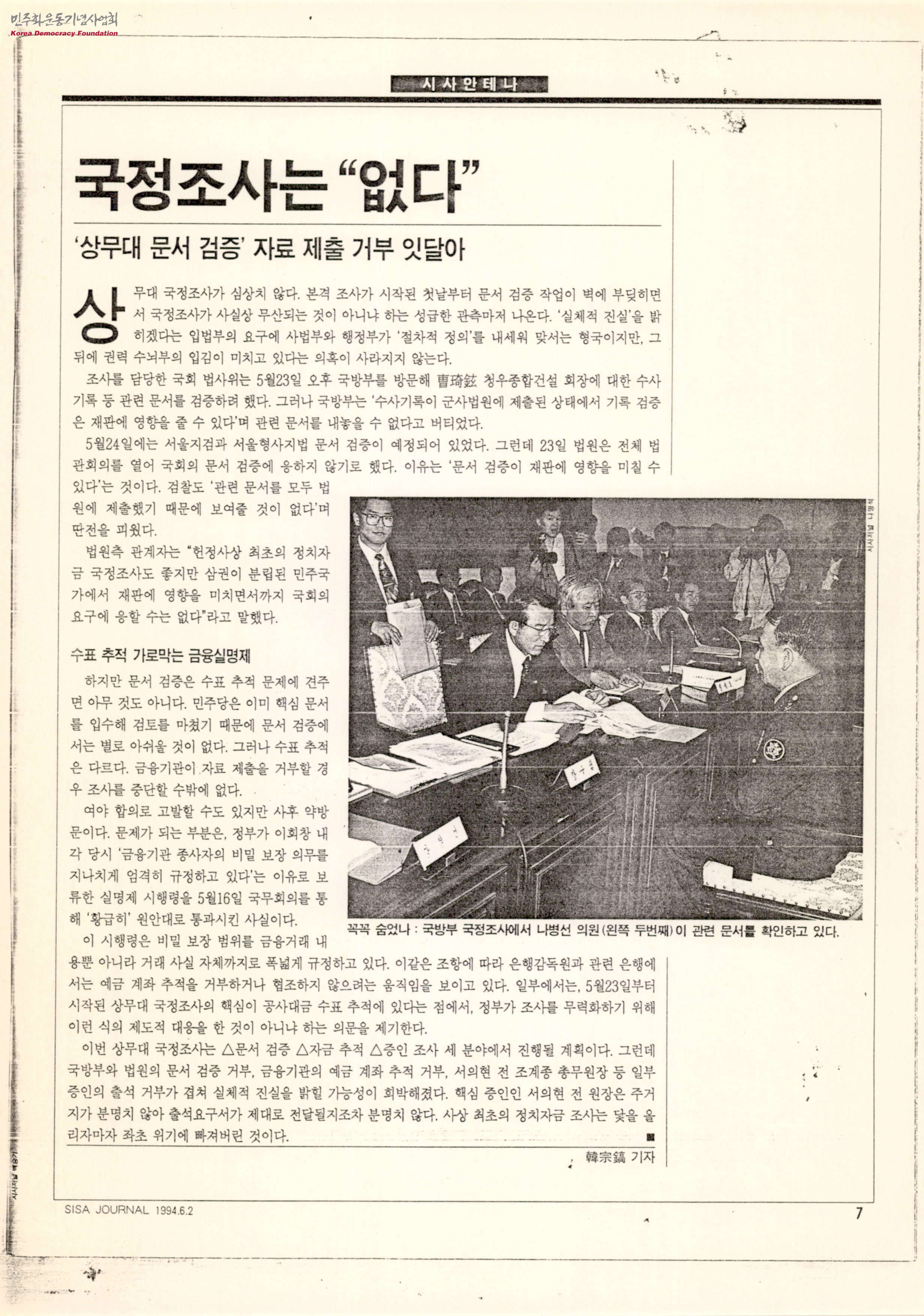 - 상무대 국정조사와 관련된 칼럼으로 문서 검증 작업이 벽에 부딪히면서 국정조사가 무산될 위기에 부딪치자 권력이 적용되고 있는 것이 아니냐는 의문이 발생하였다는 내용과 이 국정조사와 연루되어 문서검증과 금융실명제로 인해 어려움을 겪고 있는 수표 추적 문제에 대한 스크랩